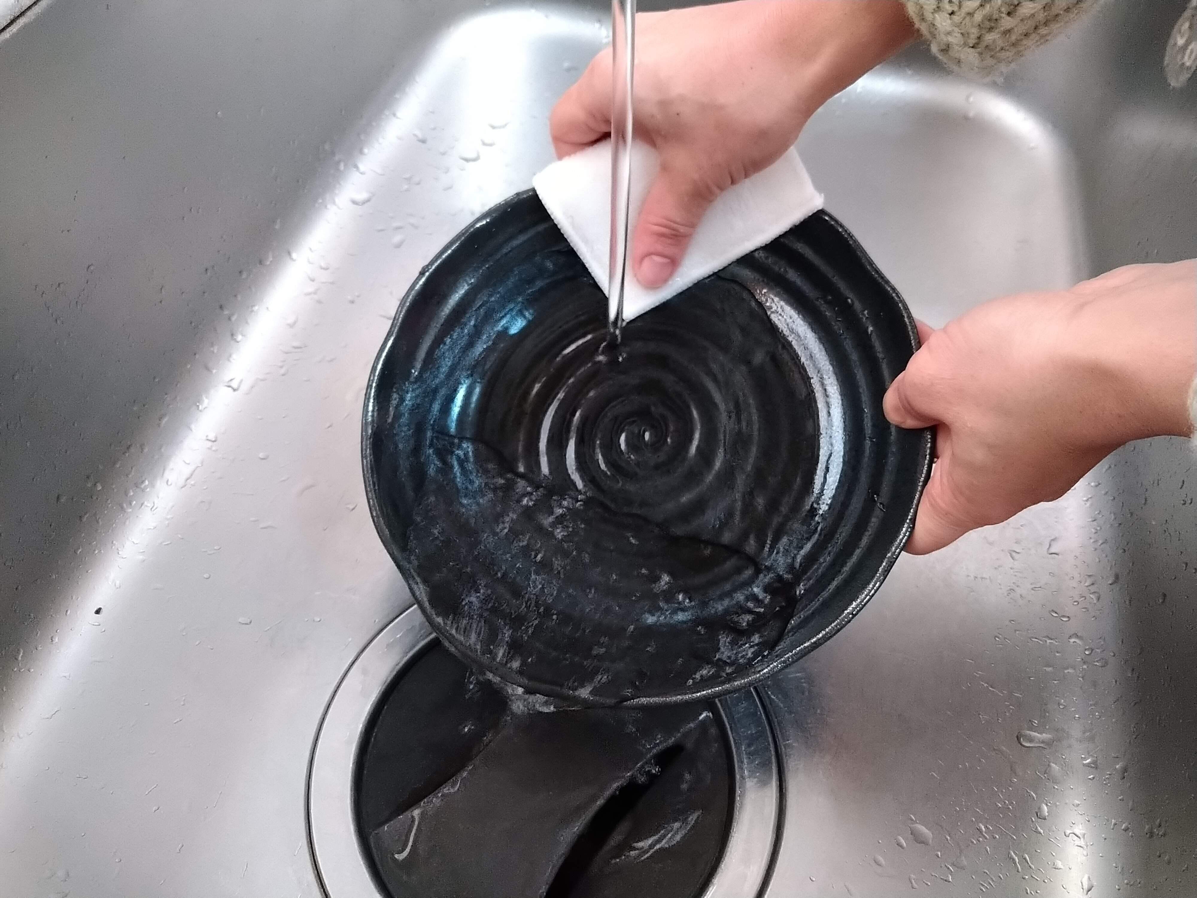 超極細繊維が細かい汚れまで掻きとってくれるので、食器を洗うのに洗剤がいりません。水を流しながら擦り洗いですっきりキレイになります。軽い油汚れにはお湯を使うといいですね。