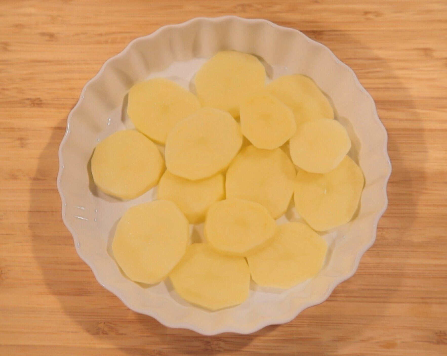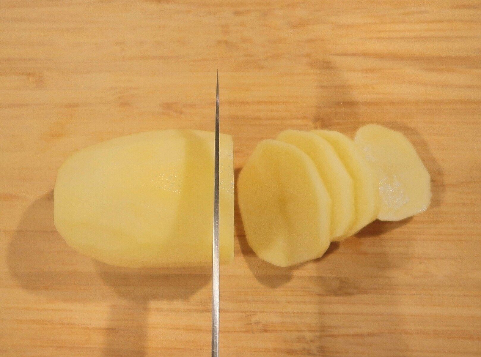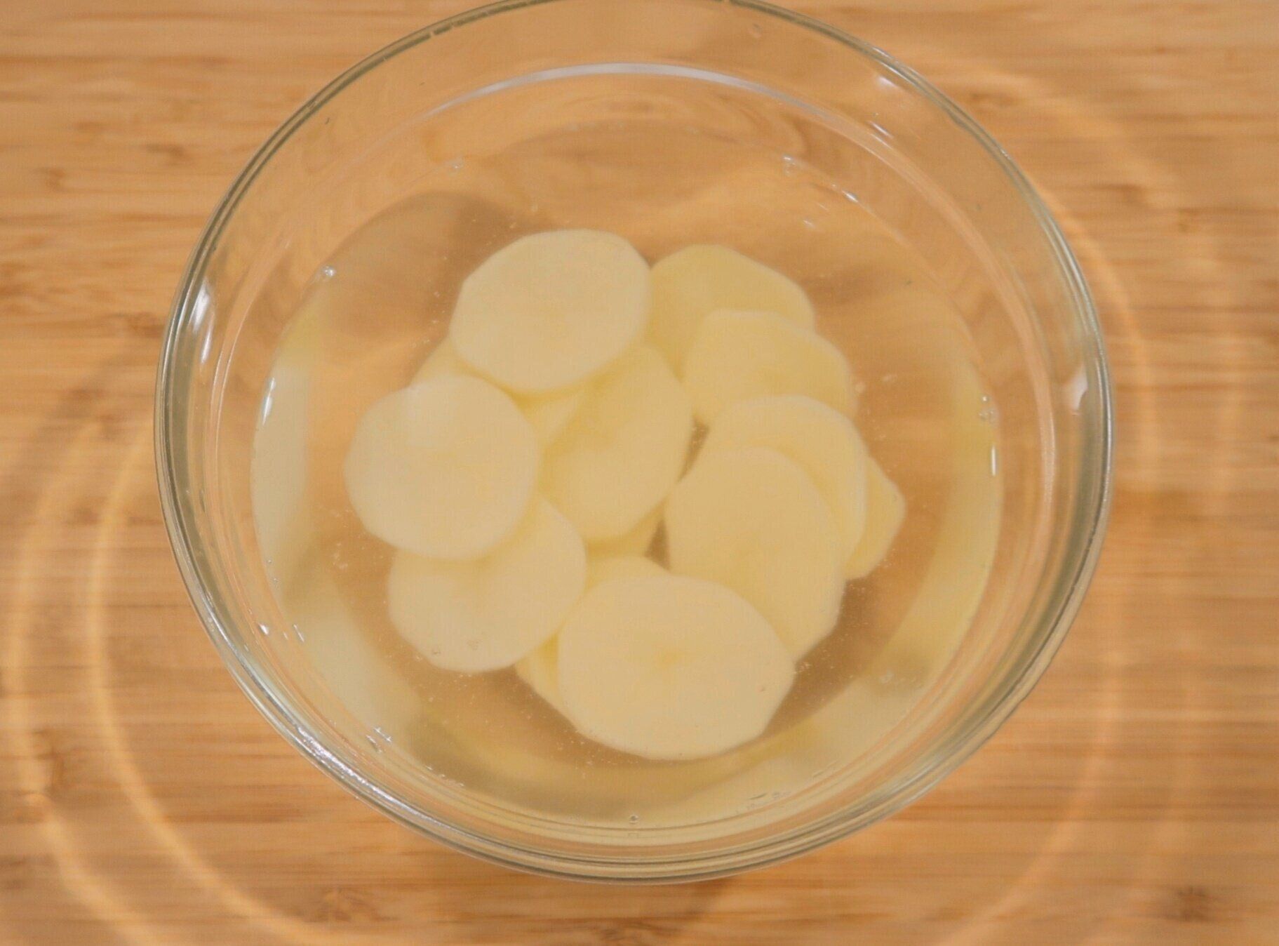 じゃがいもは皮をむいて芽を取り除き、5mm幅の輪切りにします。