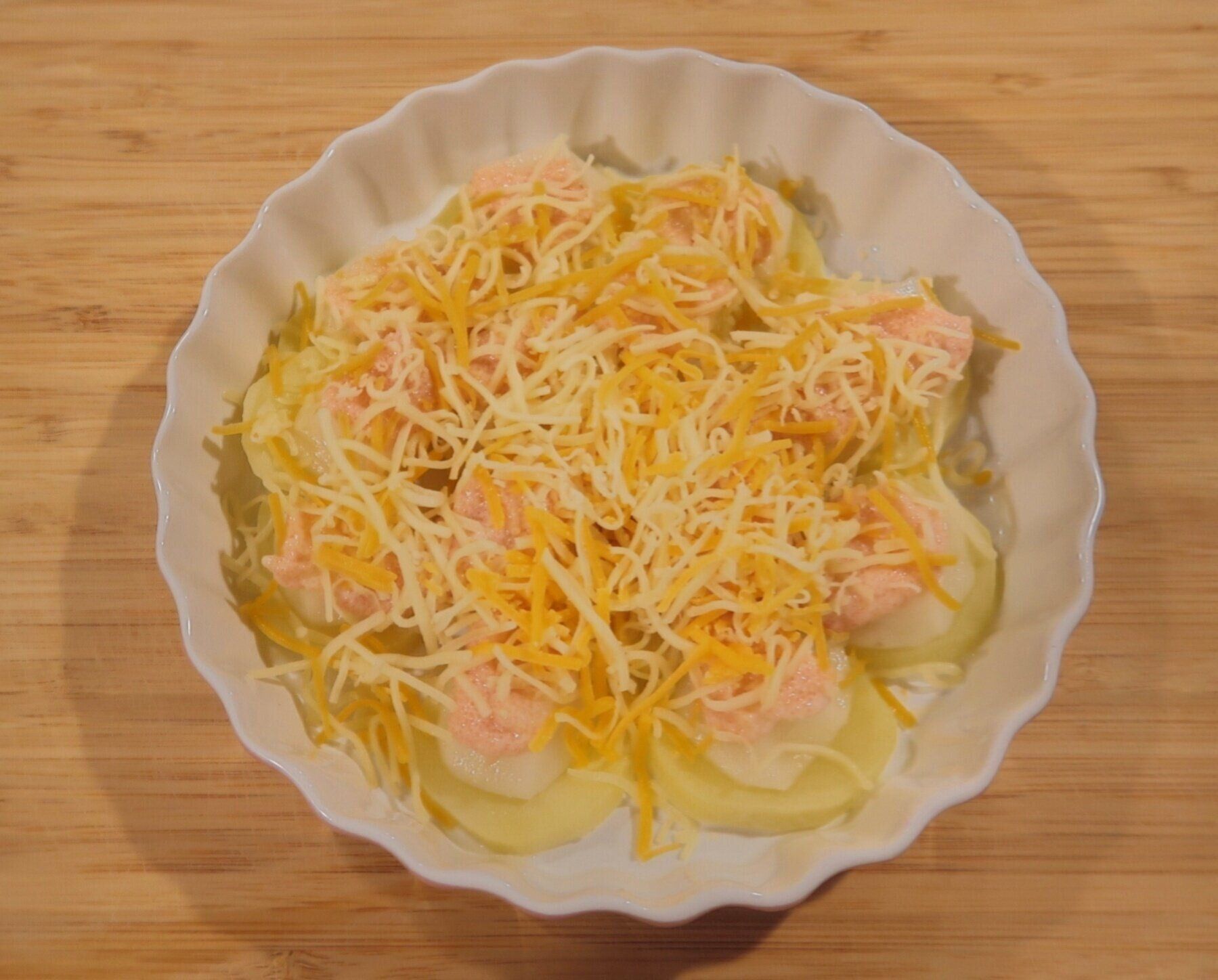 ラップを外し、じゃがいもに塩(少々)をふり下味をつけます。つづいてカットしたお餅をじゃがいもの上にのせ、再びふんわりとラップをかけて電子レンジ(600w)で約1分半加熱します。