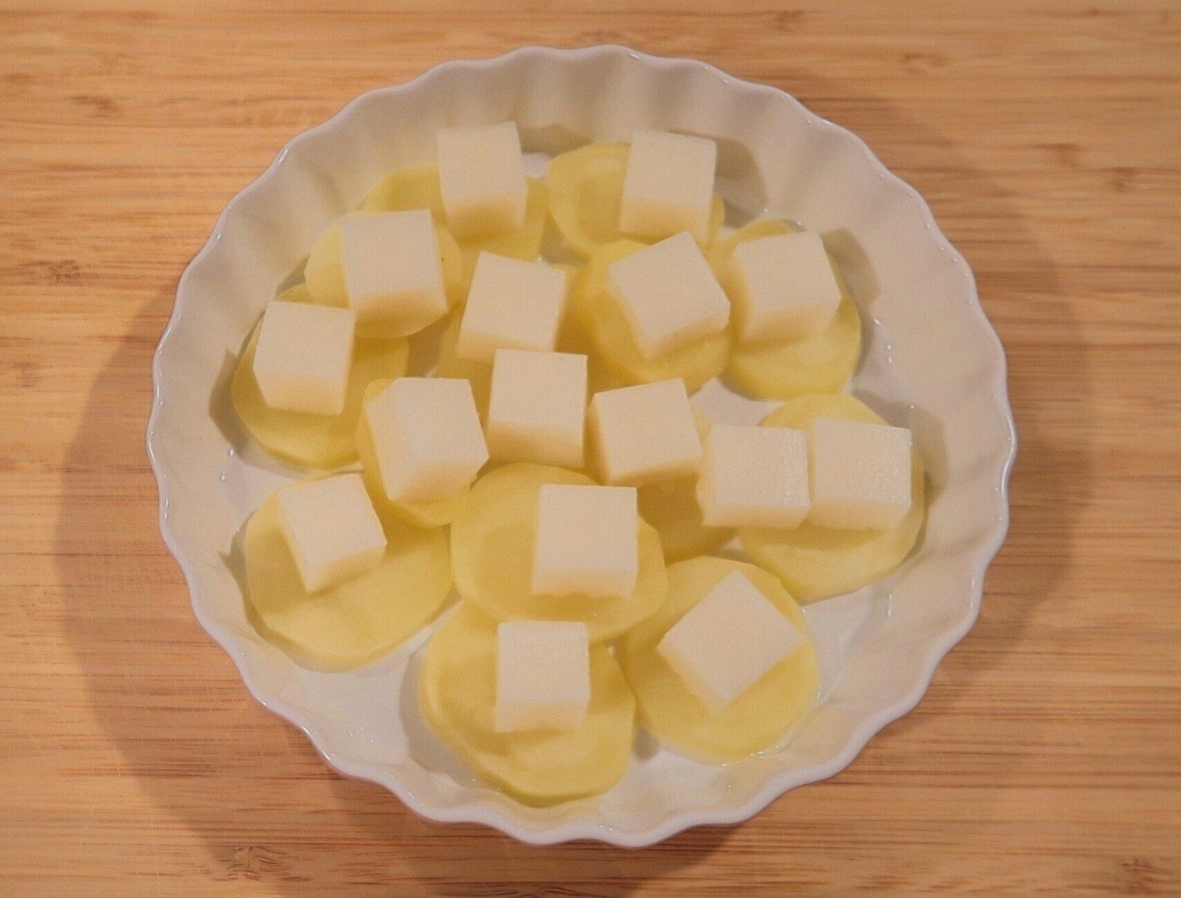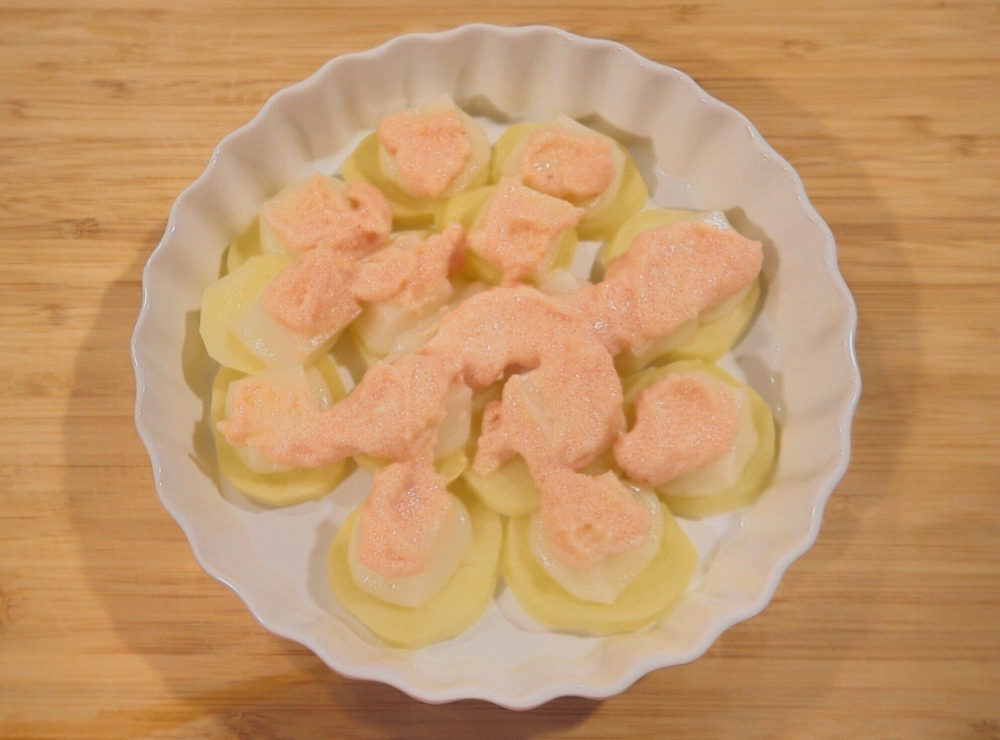 サラダ油を塗った耐熱皿に、じゃがいもをなるべく重ならないように並べます。つづいてふんわりとラップをかけて電子レンジ(600w)で約2分半加熱します。竹串をさして、スッととおるくらいの柔らかさになればOK!