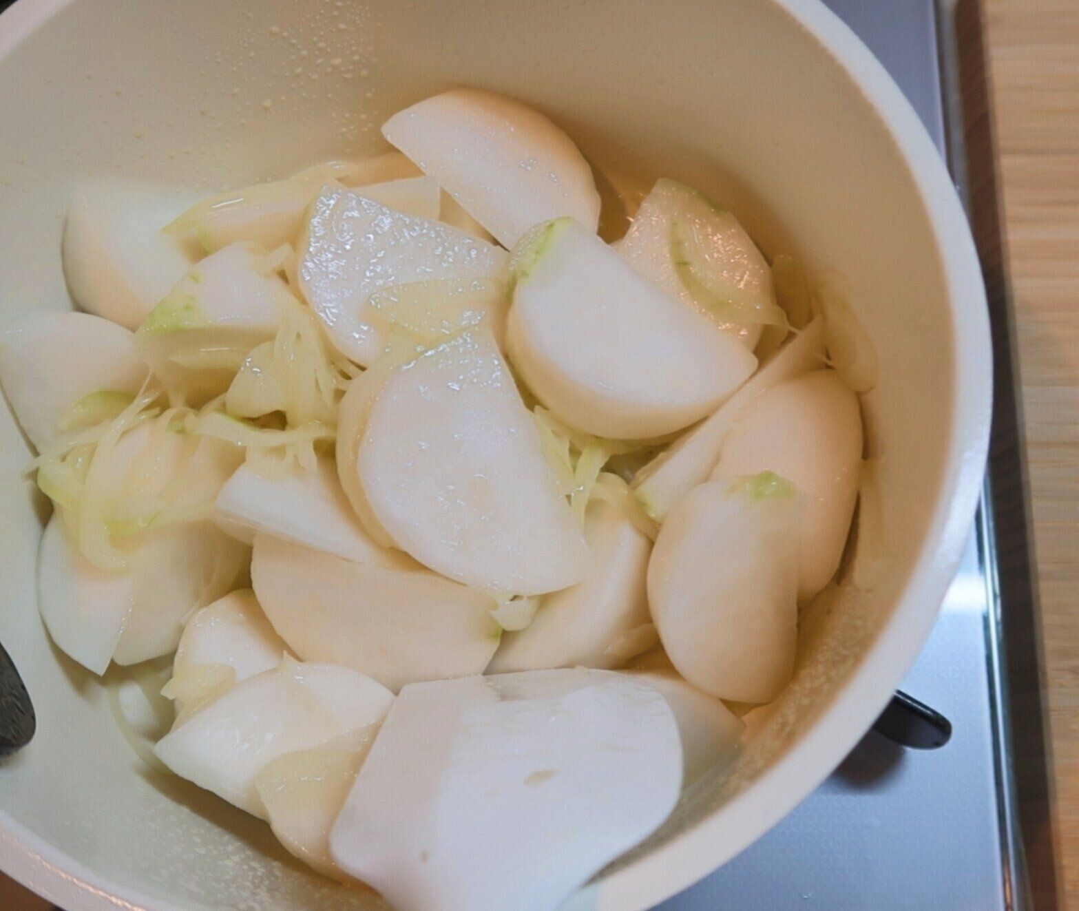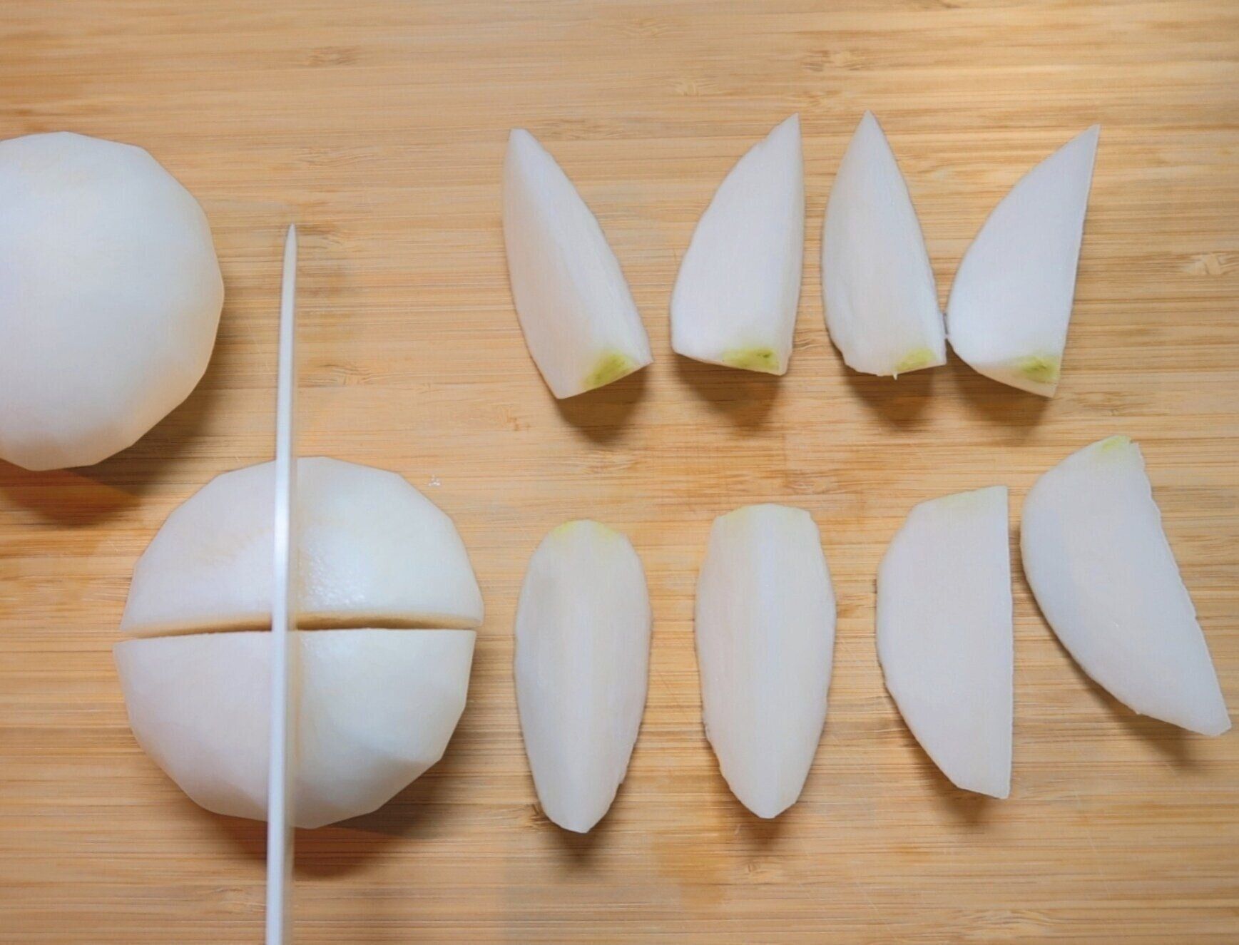 かぶは茎を切り落とし、皮をむいてたて8等分のくし切りにします。