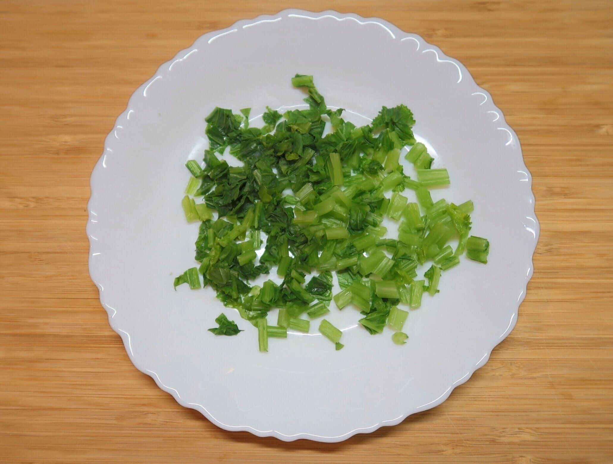 かぶの茎と葉をトッピングに使用する場合は、細かく刻んで耐熱皿にのせ、ふんわりとラップをかけて電子レンジ(600w)で約2分加熱します。