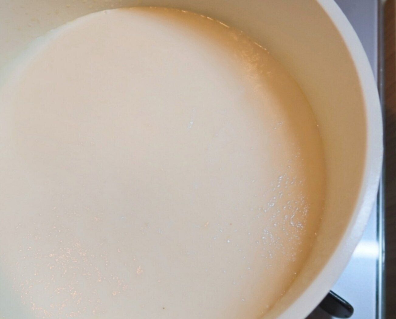 あら熱がとれたら牛乳(100ml)とともにミキサーにかけ、鍋に戻します。