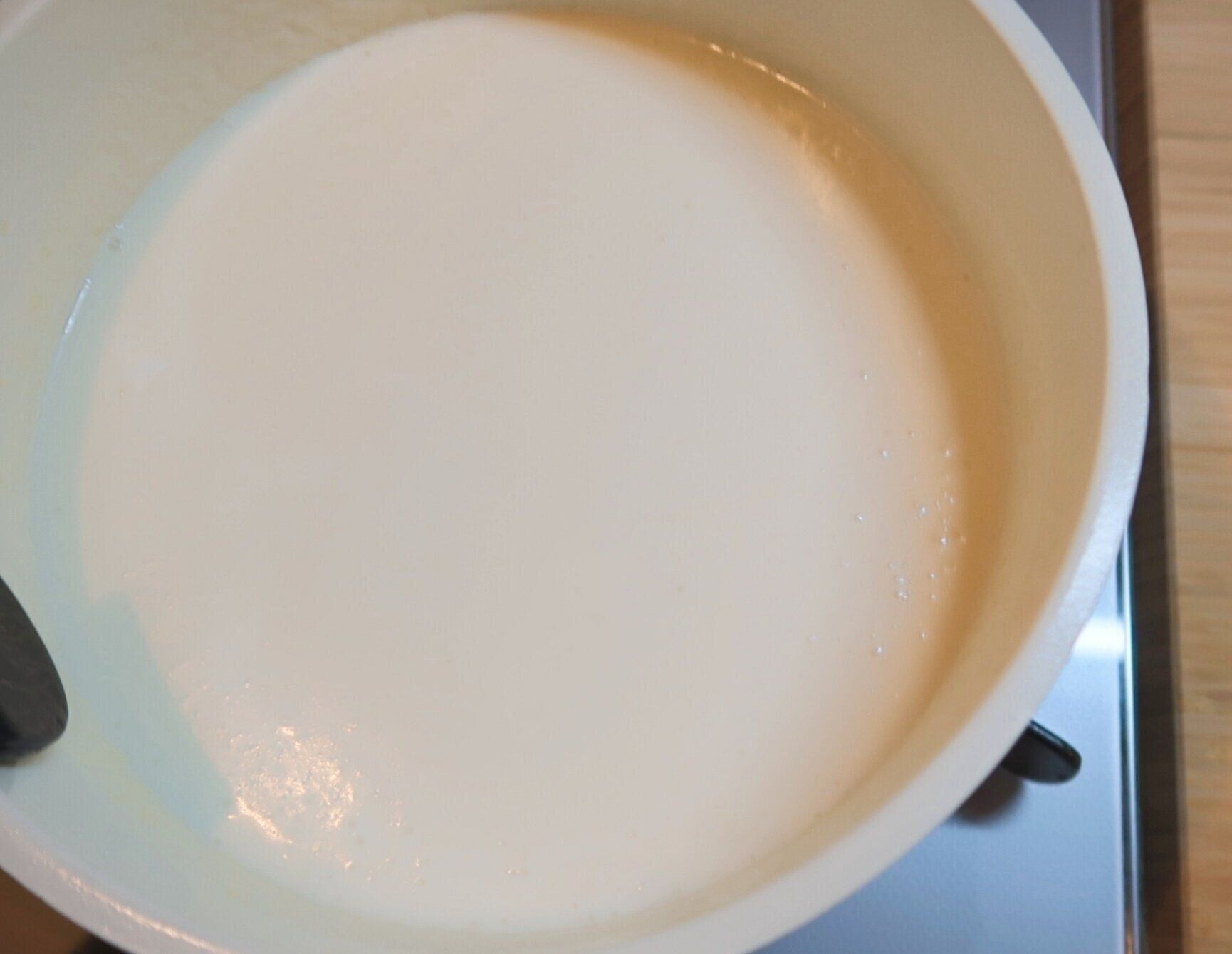 生クリームを加え混ぜ合わせ、弱火にかけてあたためます。最後に味見をして塩、こしょうで味をととのえます。