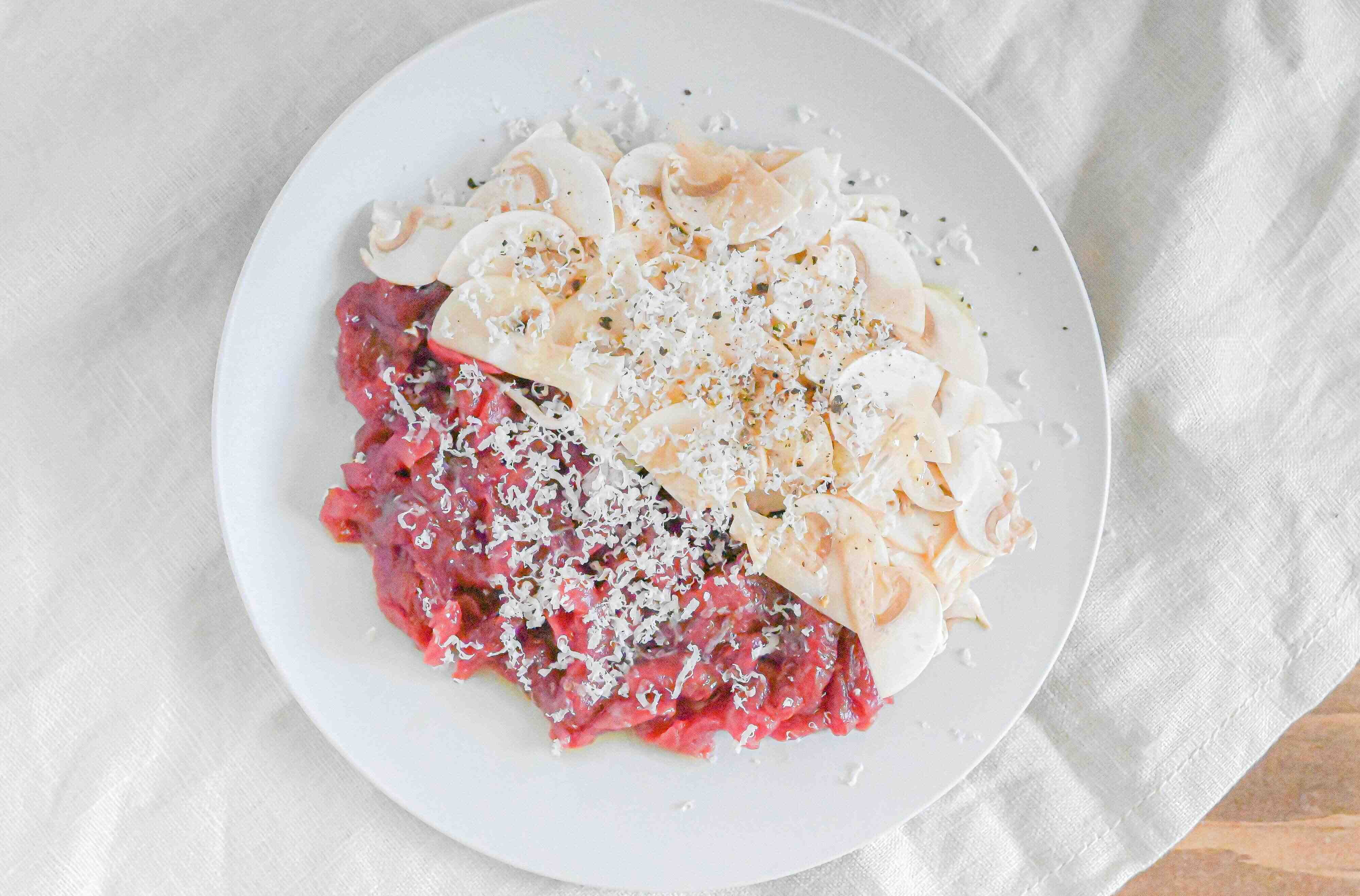 馬肉に生のマッシュルームと旨味のあるチーズを合わせるレシピです。