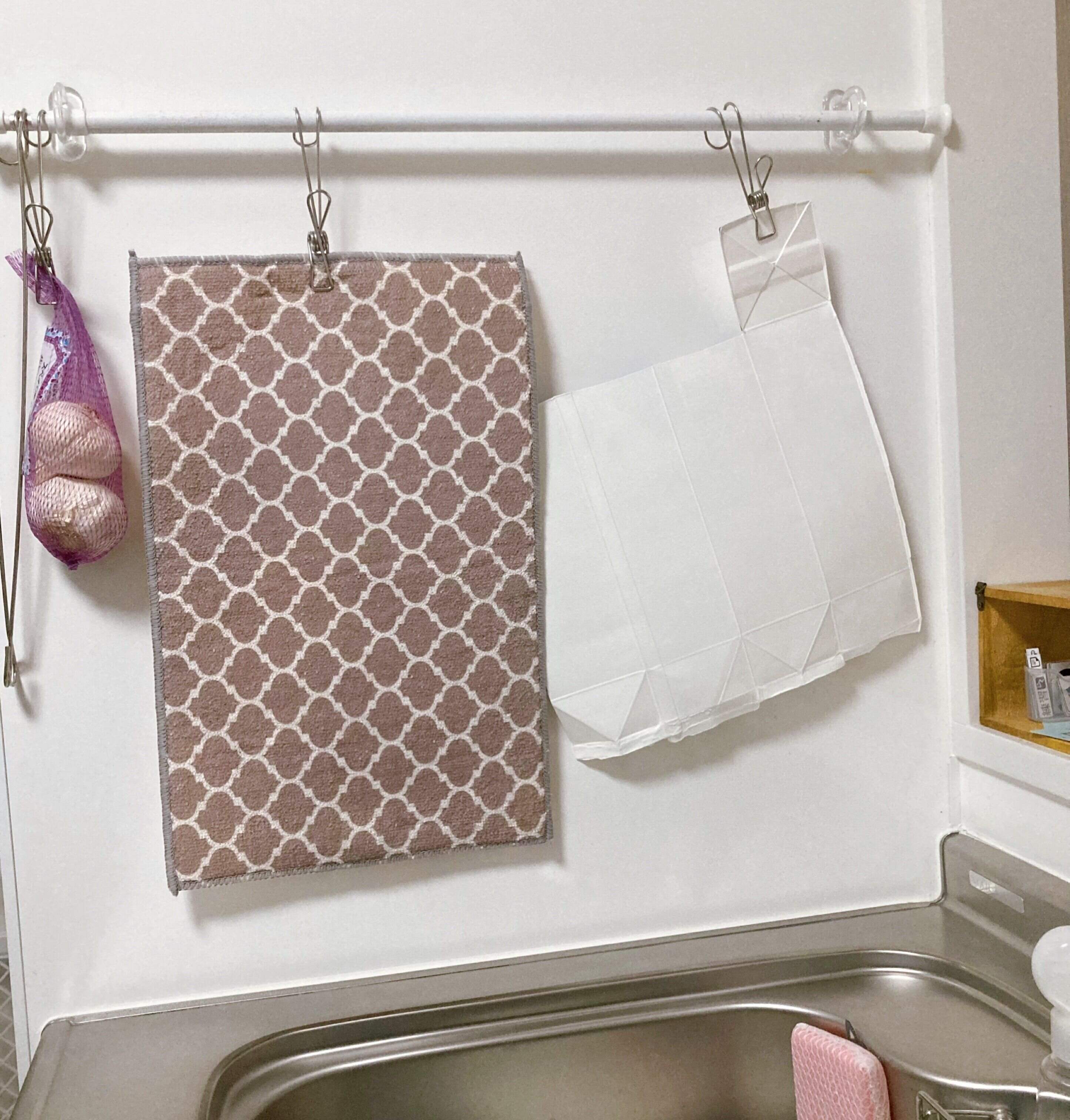 わが家のシンクは横が壁になっているのでそこに突っ張り棒をつけて、引っかけスペースを作りました。