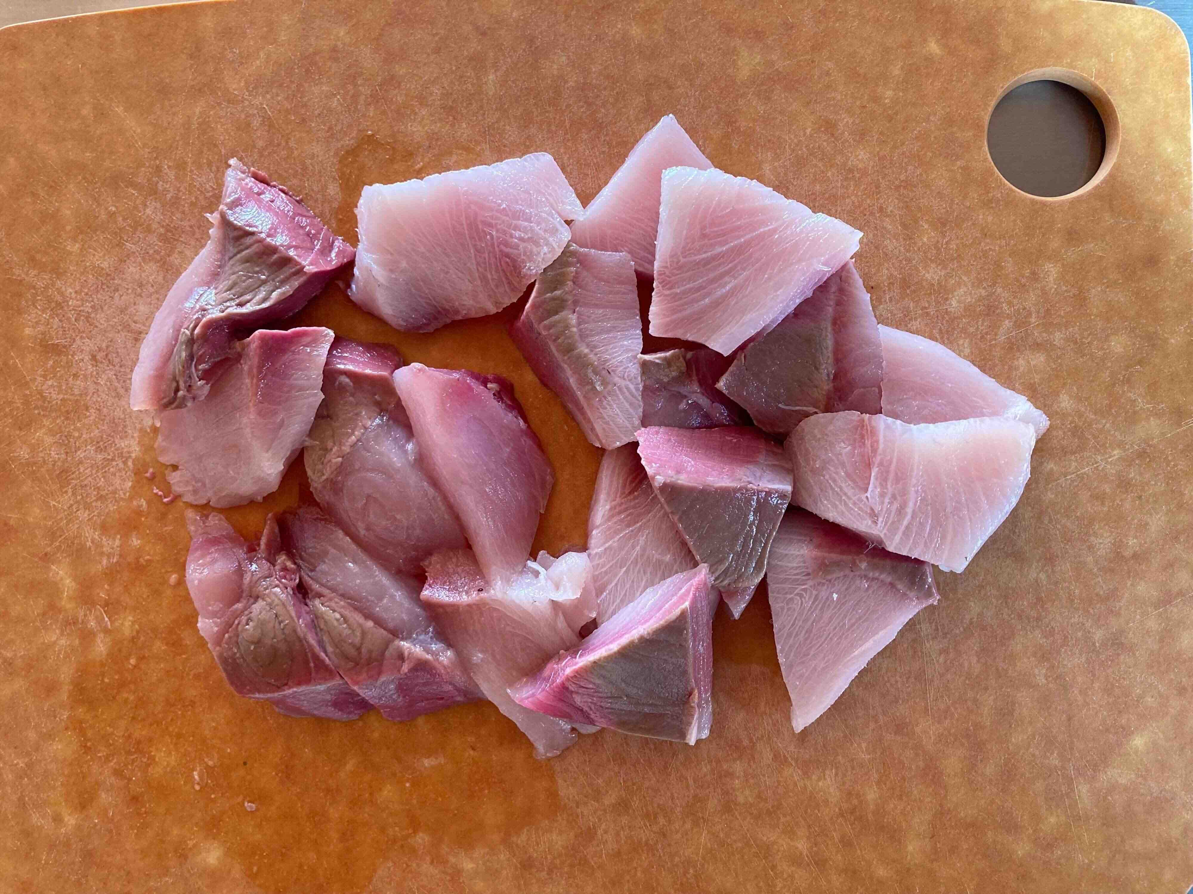 3.ブリは皮を切り落とし、一口大くらいの大きさに切る。