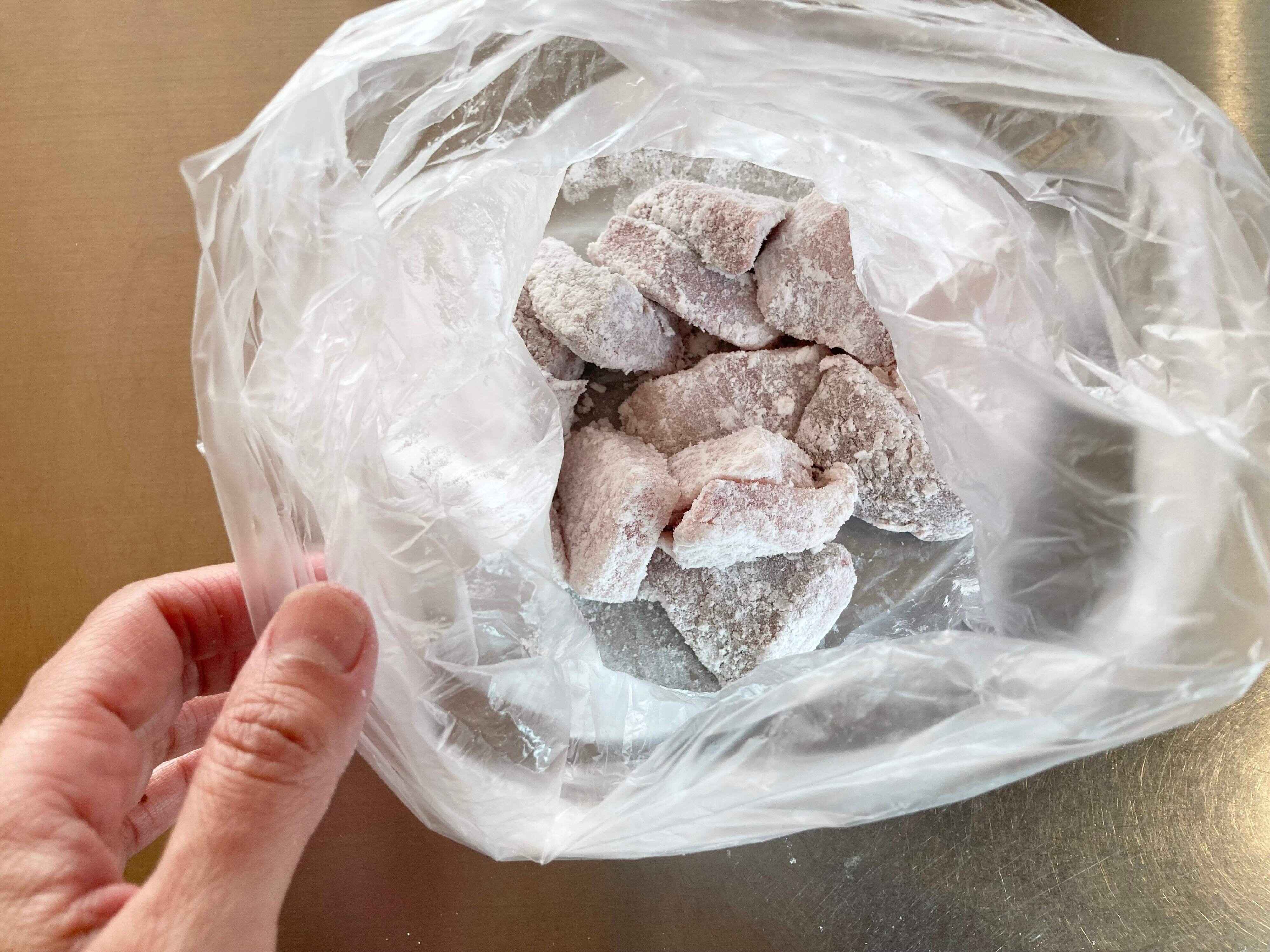 4.袋に片栗粉を入れ、3のブリを1つずつ入れる。袋に空気を入れて口を閉じ、静かに大きく何度か傾け、片栗粉をしっかりと付ける。
