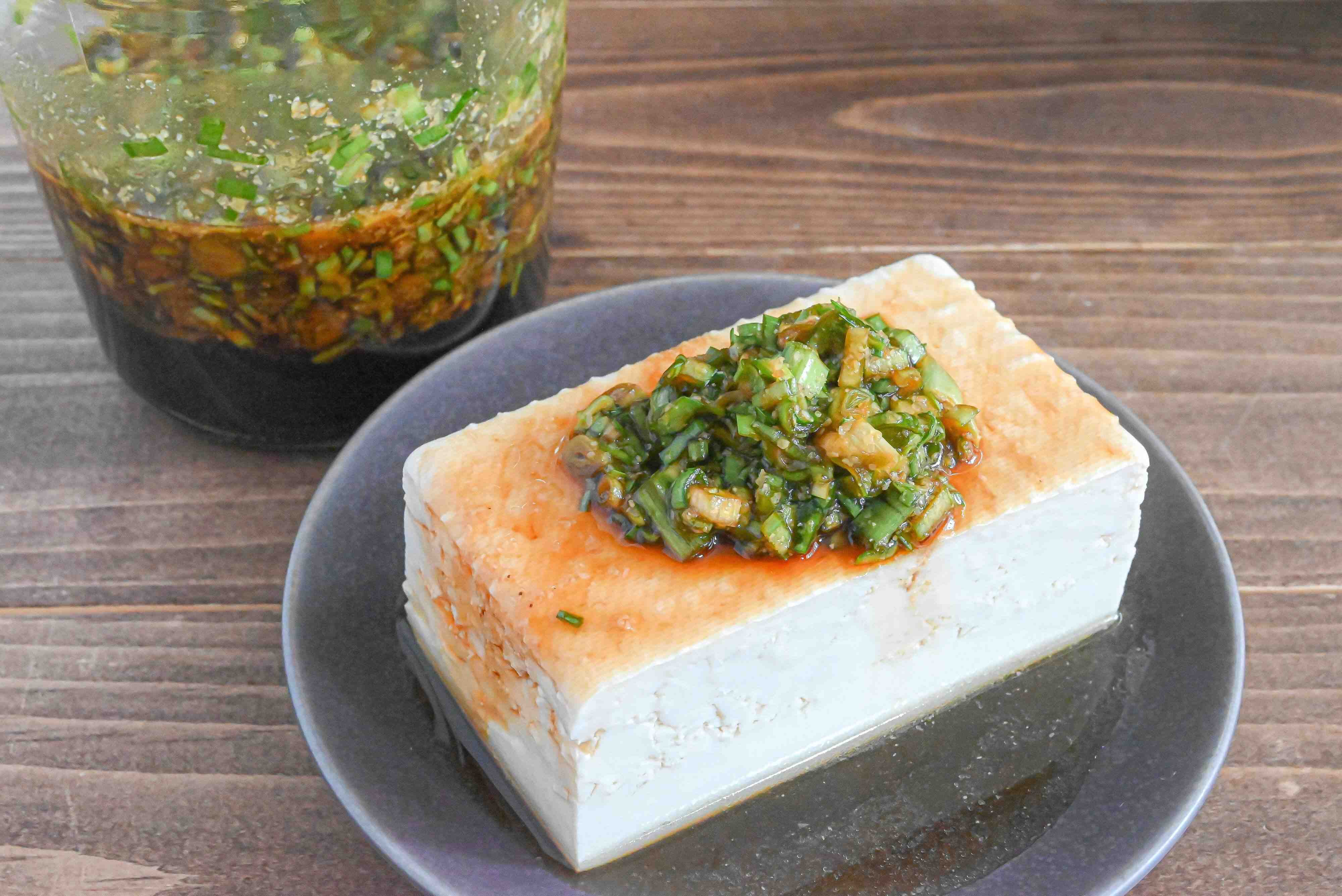 切って和えるだけで作れる「にら醤油」を豆腐にかけるレシピです。