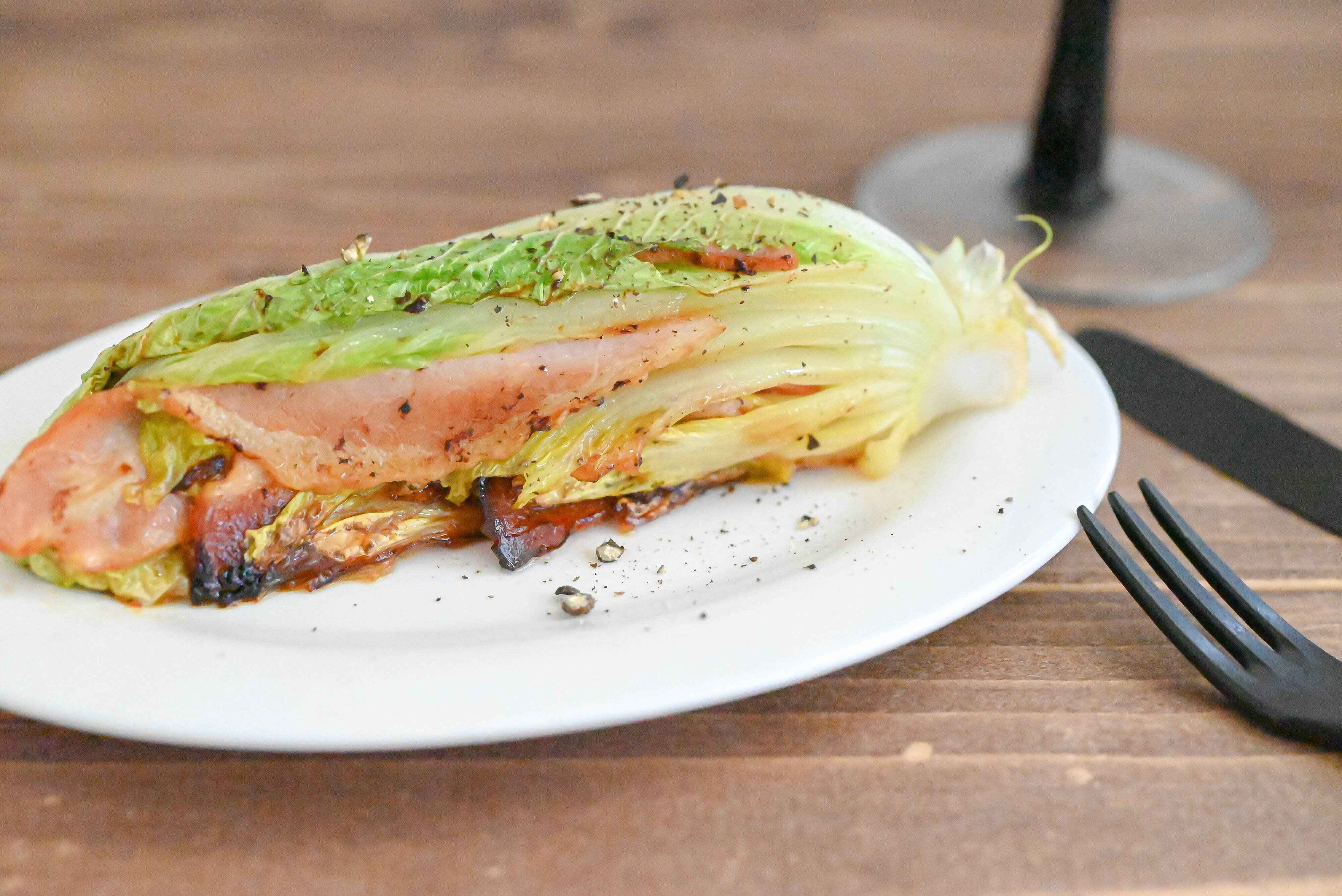 芯のついた白菜にベーコンを挟んで焼くだけ!