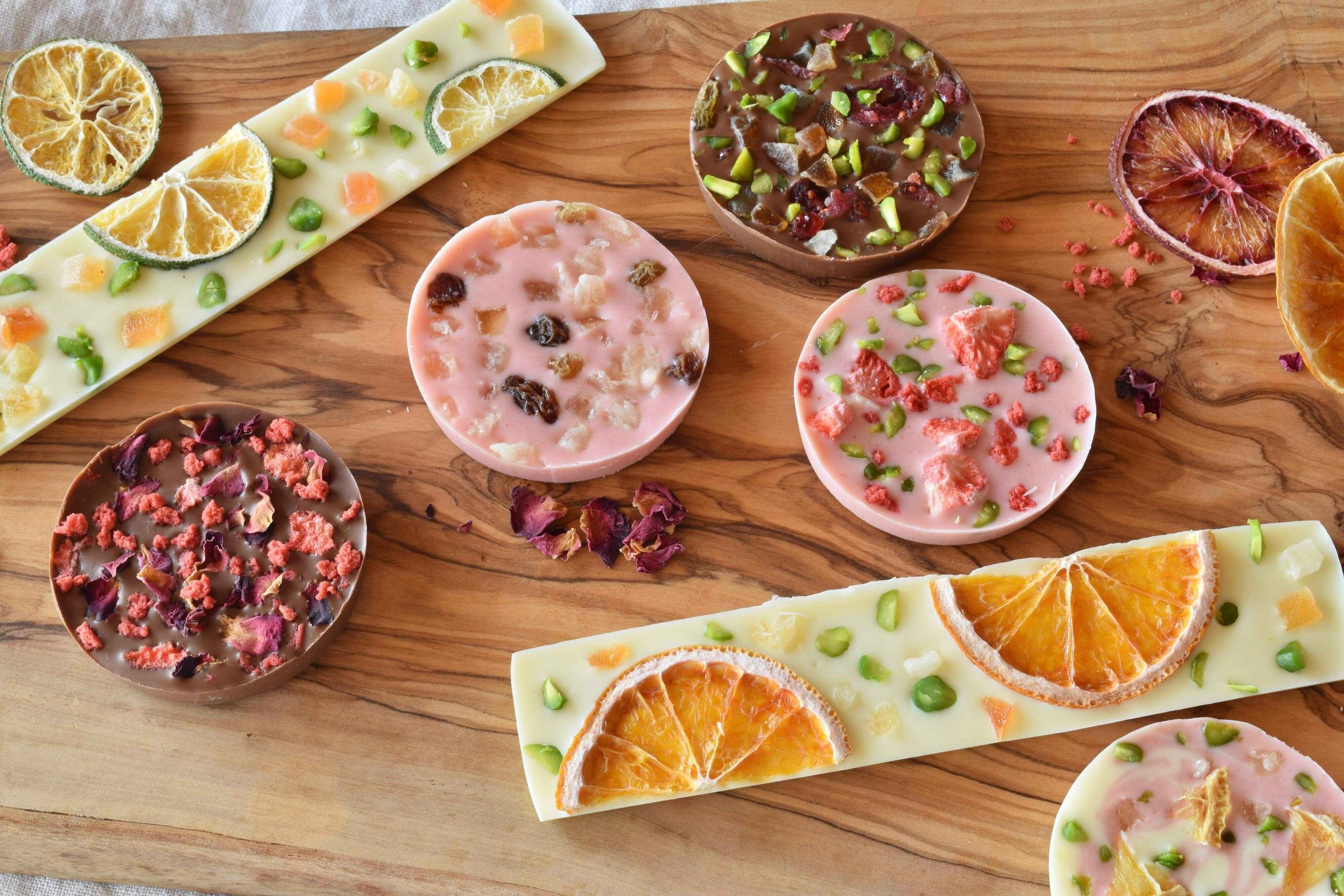 4.今回使用したトッピングは、ドライフルーツ、フリーズドライイチゴ、ピスタチオ、食用花です。ナッツやクッキー、マシュマロなどお好みでどうぞ。