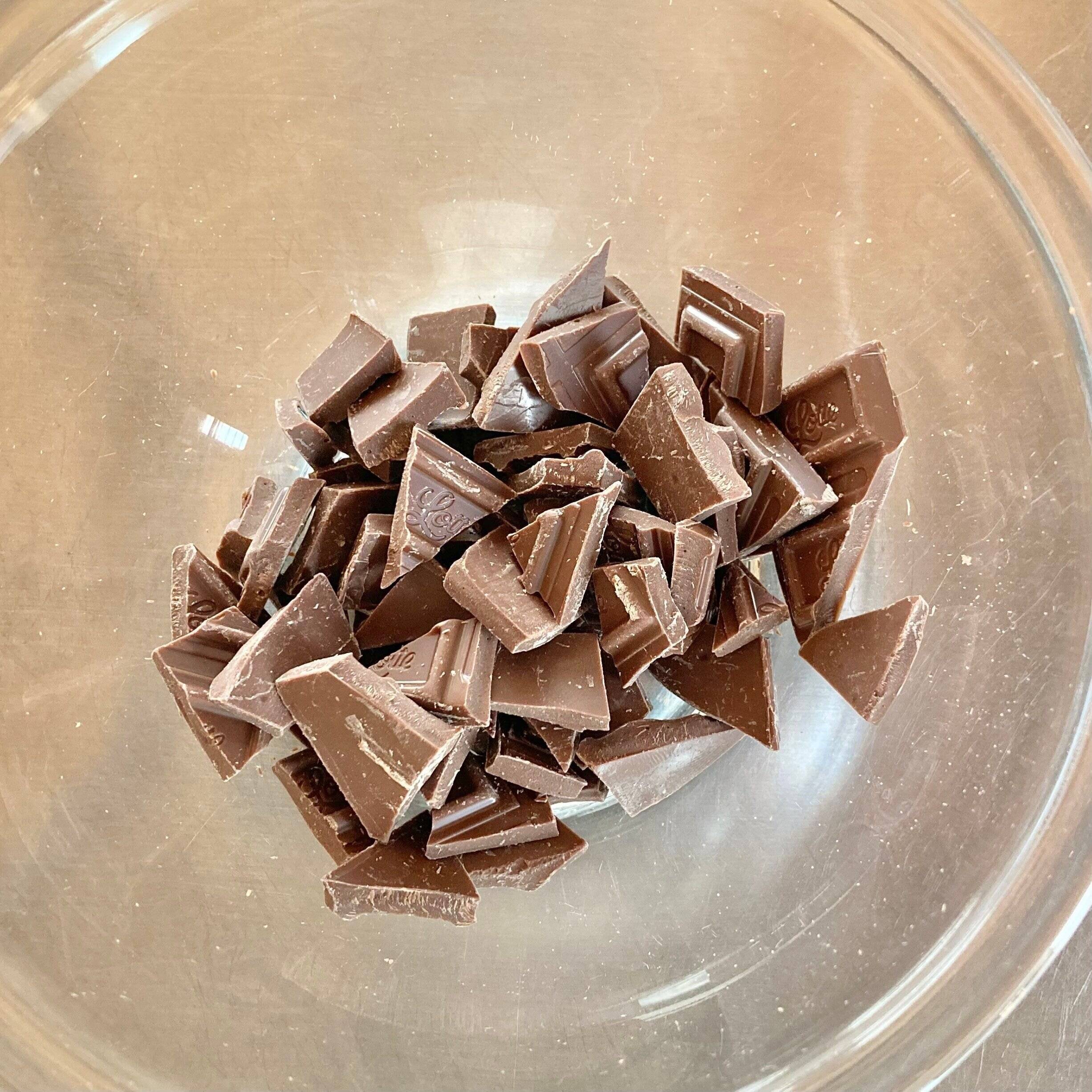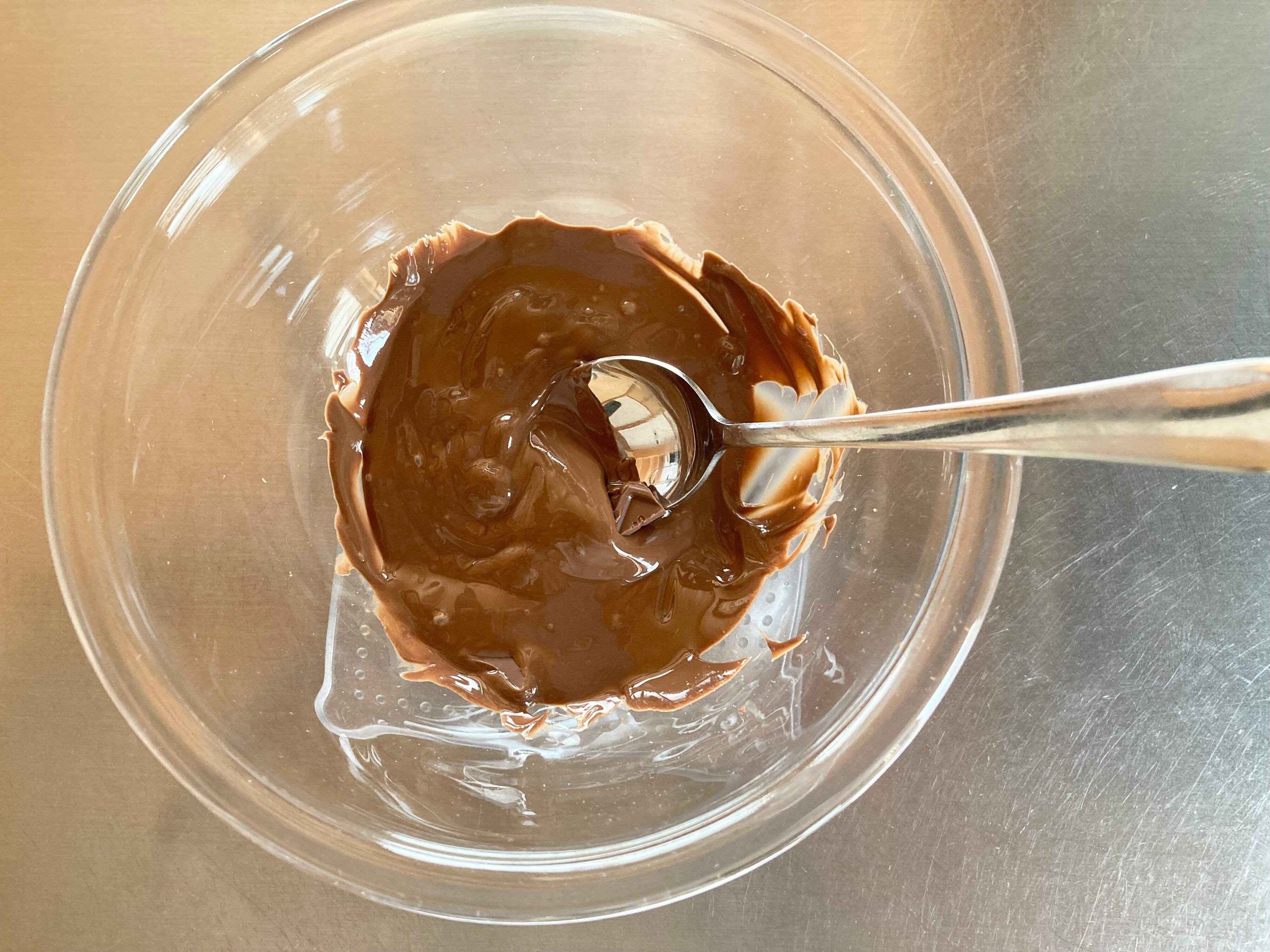 1.電子レンジ使用可能な器にチョコレートを細かく割って入れる。600wで2分前後加熱する。