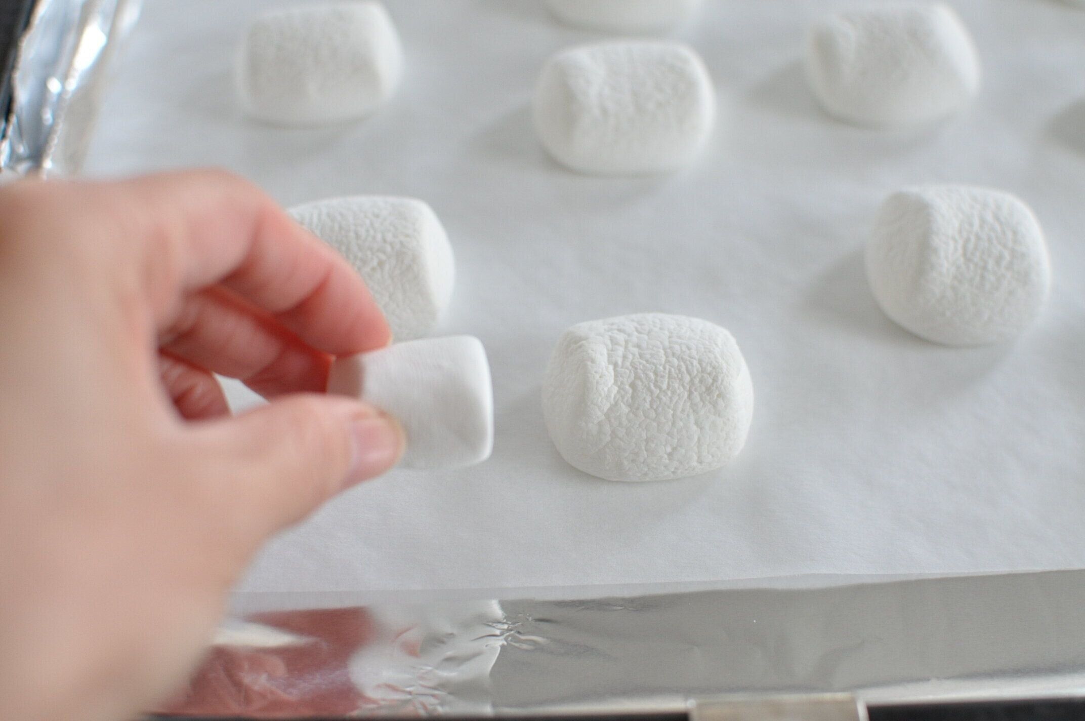 オーブンの天板にクッキングシートを敷いて、マシュマロを並べます。マシュマロが膨らむので、多少間隔をあけてください。
