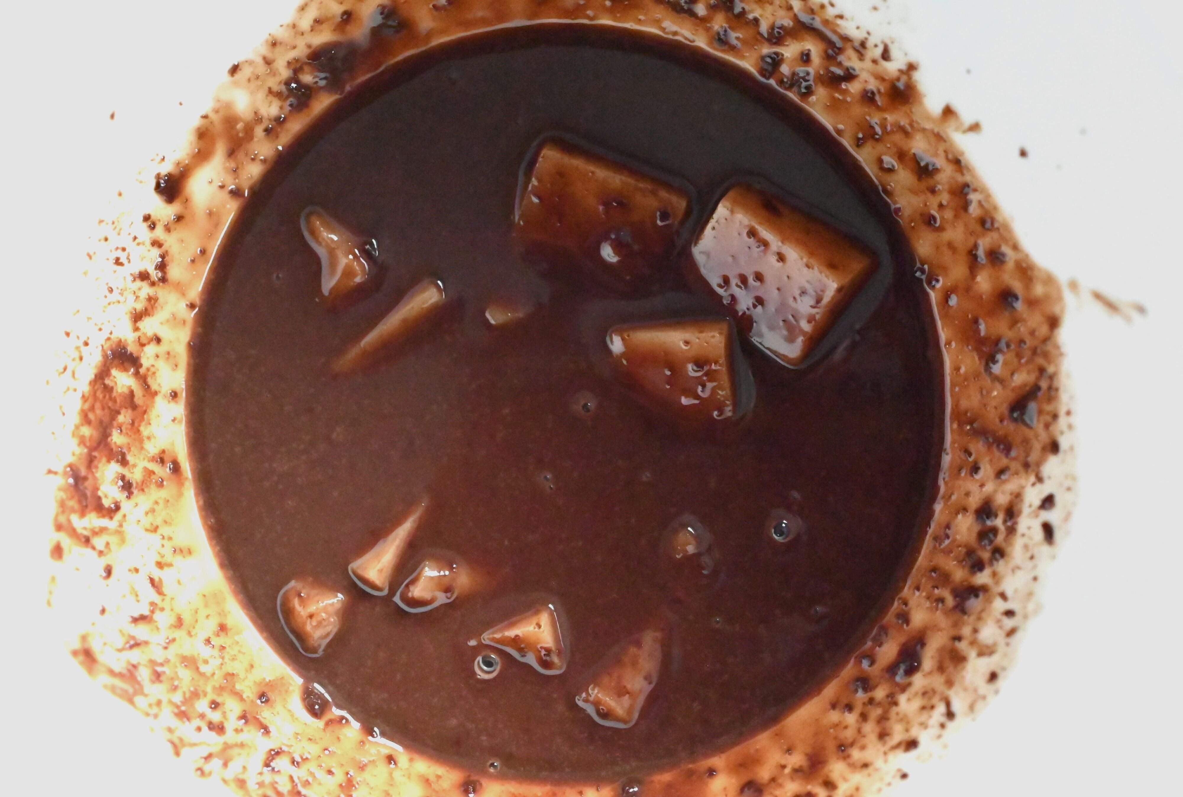(2)チョコレートを手で小さく割り、すべての材料を耐熱皿に入れる。