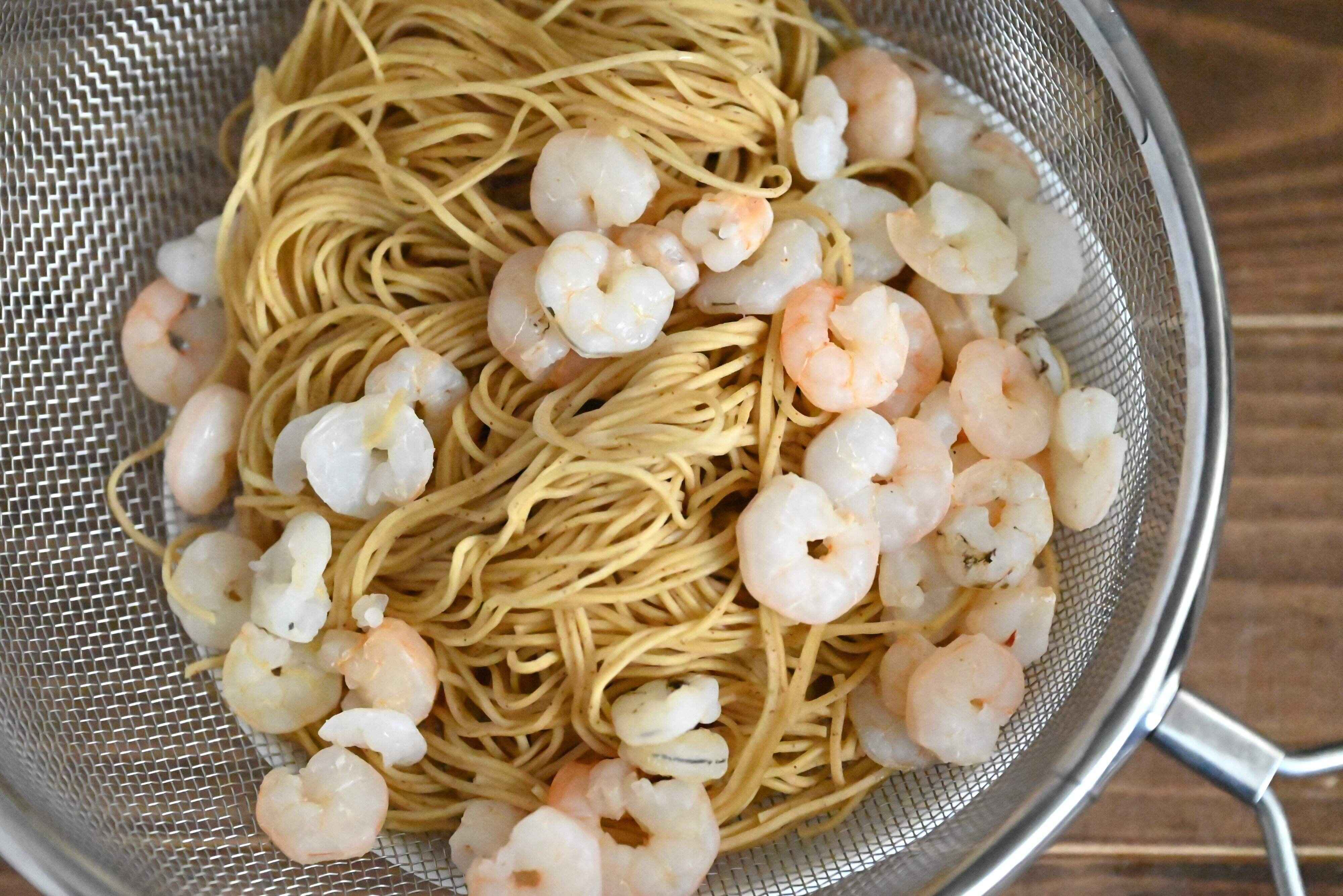 (2)再び沸騰したら蝦子麺を加えてほぐしながら1分ゆでてザルに上げ、