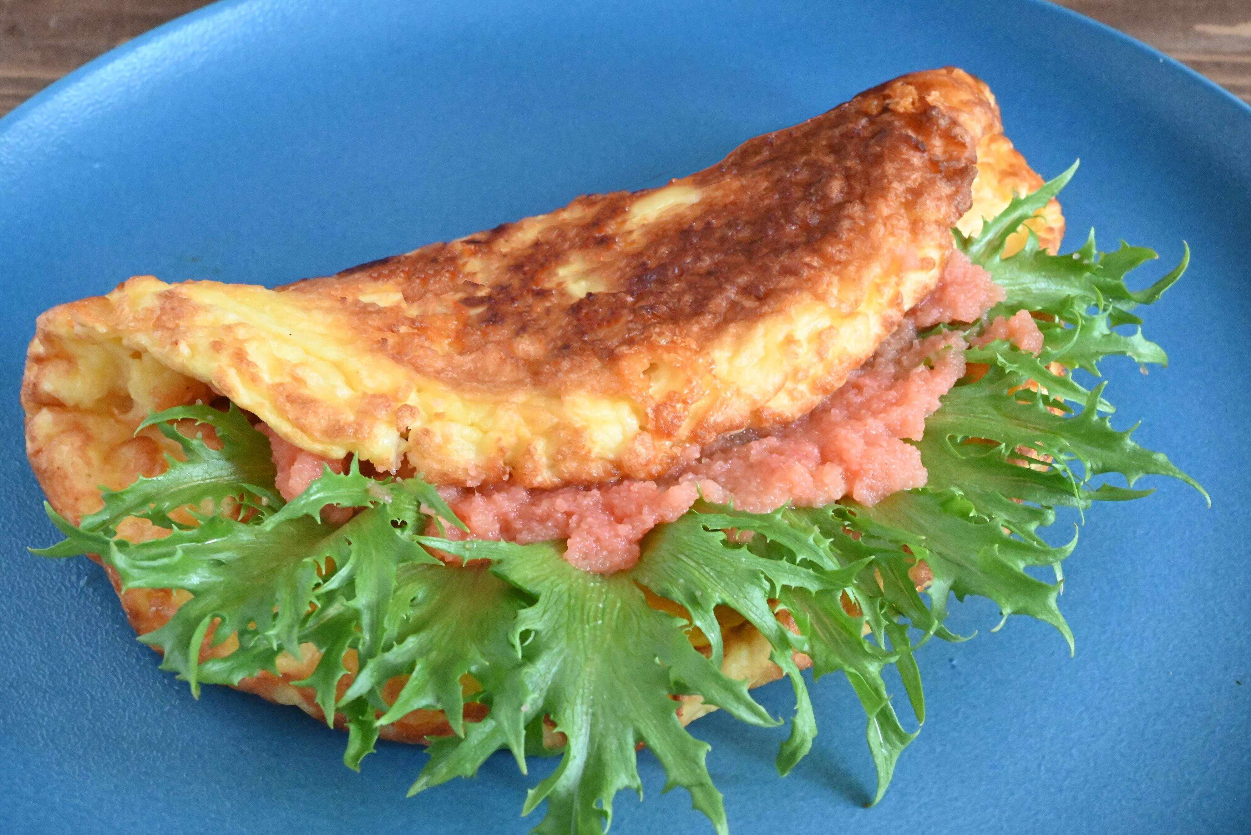 (7)フリルレタスと明太子を広げてのせ、半分に折って完成。