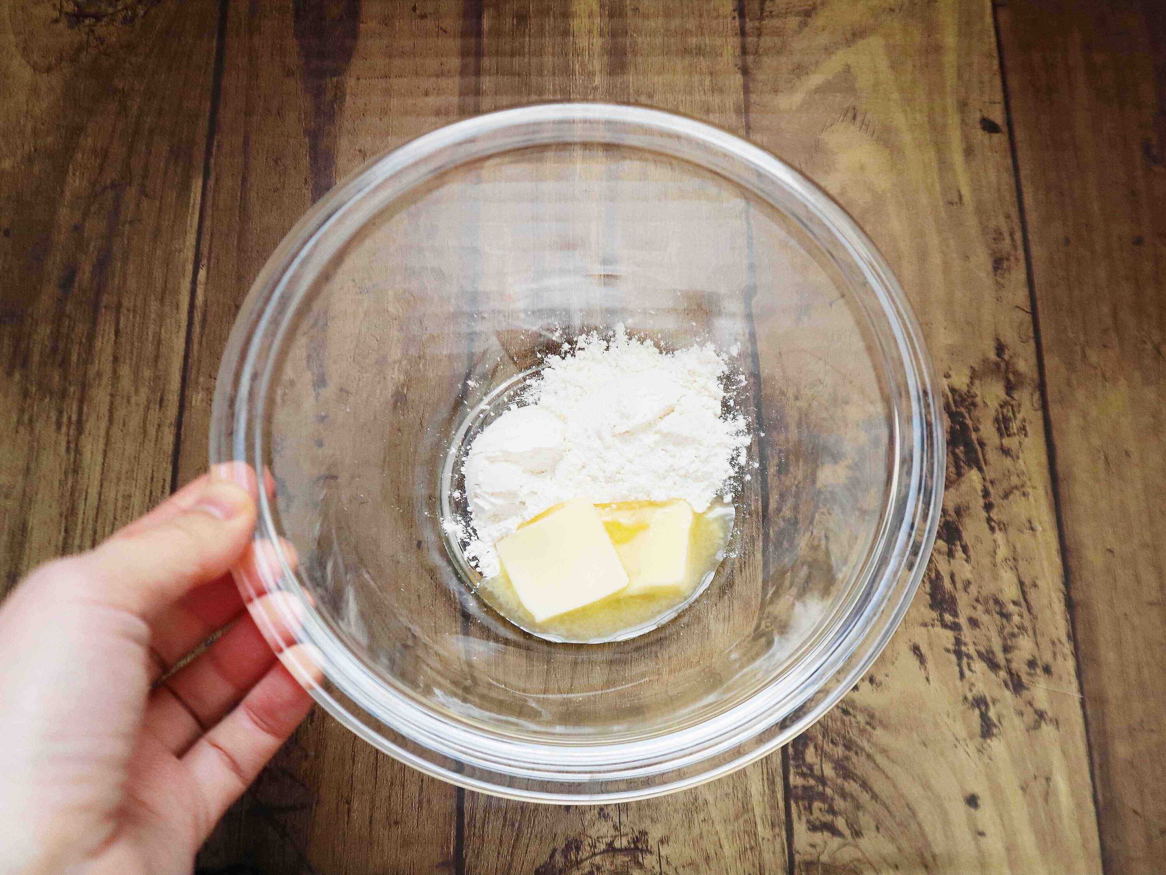 (1) 耐熱ボウルにバターと薄力粉を入れ、ふんわりとラップをしてレンジで600W×30秒加熱する。