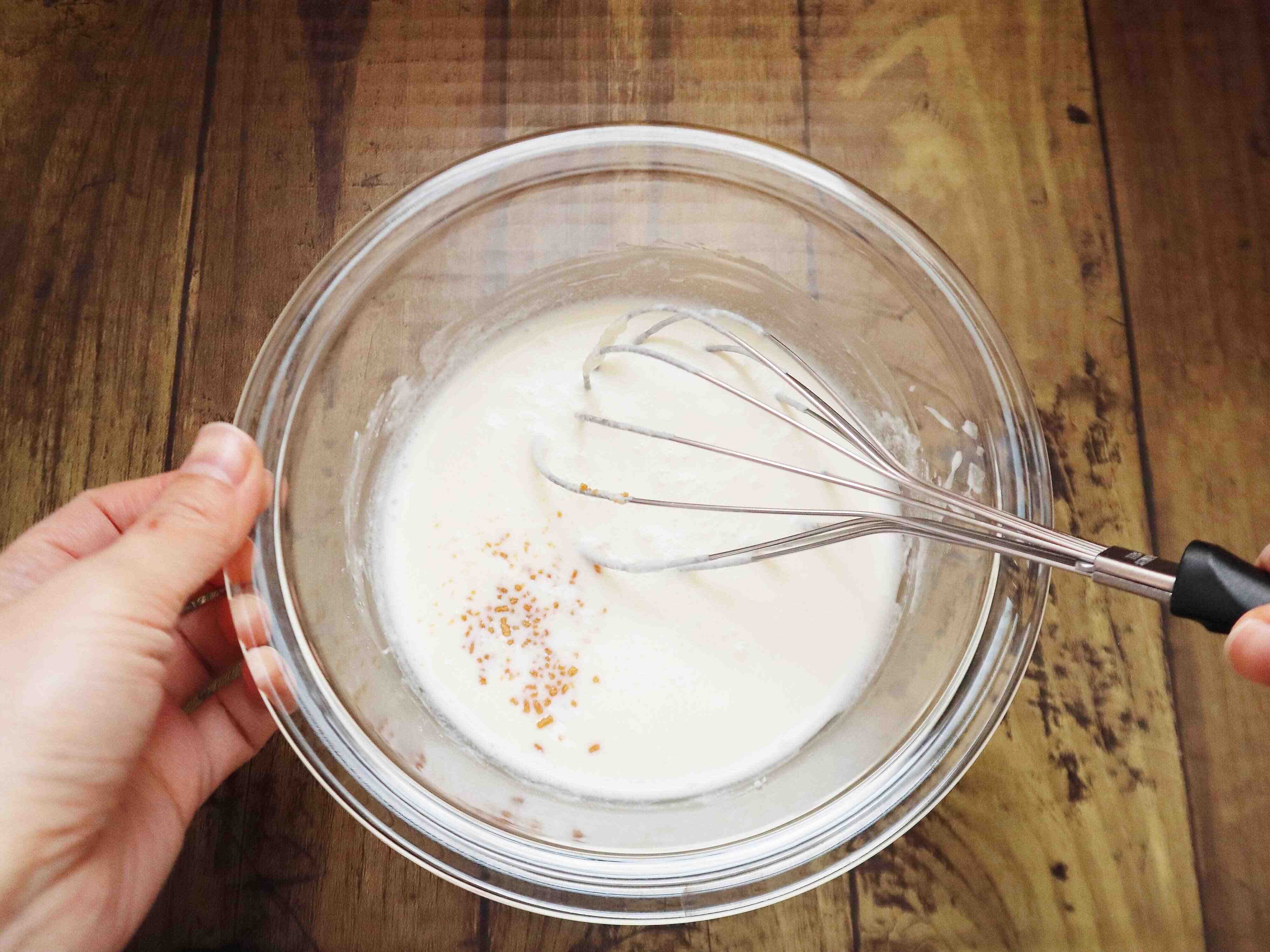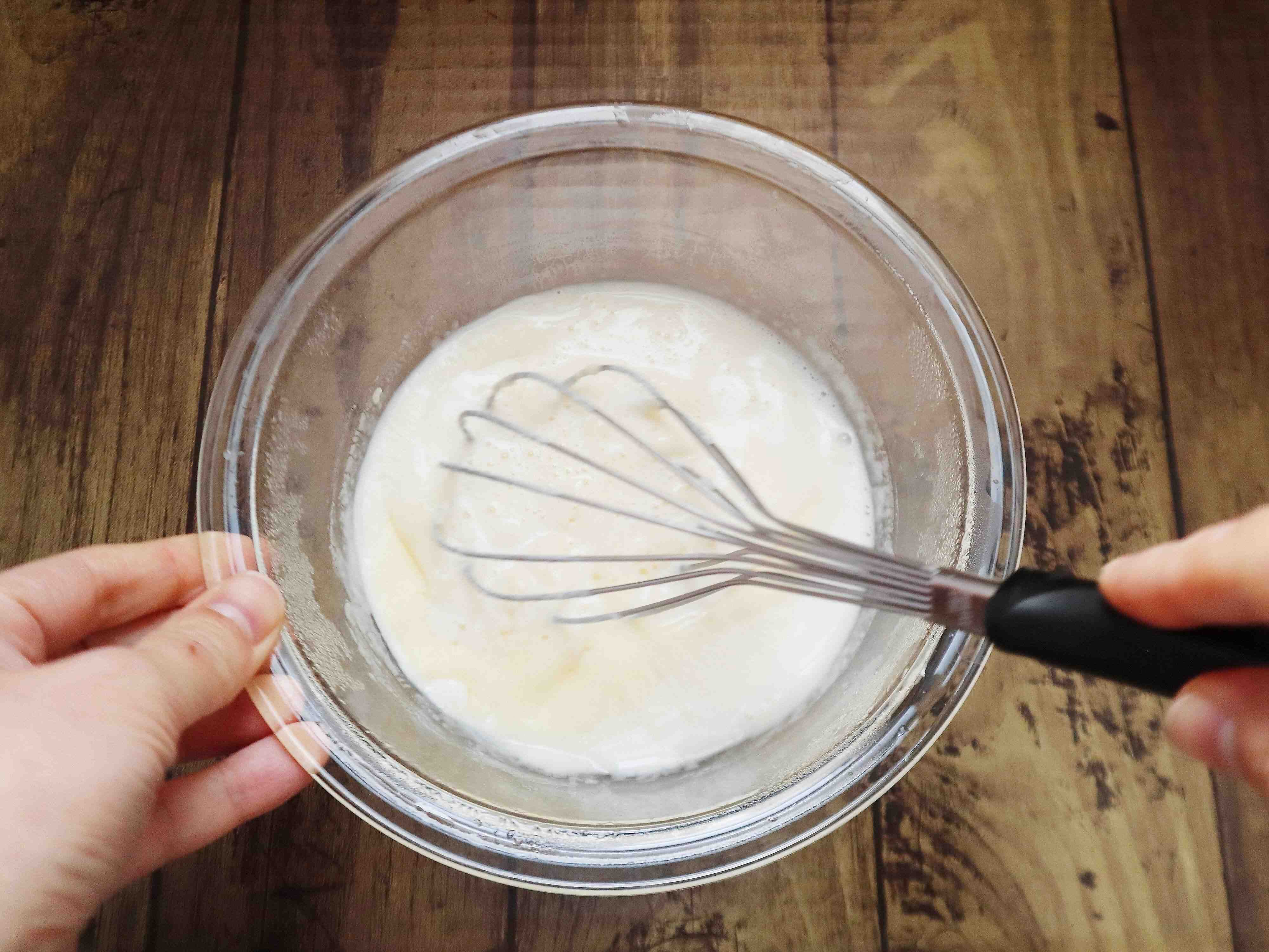 (3) 牛乳を3回くらいに分けて加え、その都度よく混ぜる。