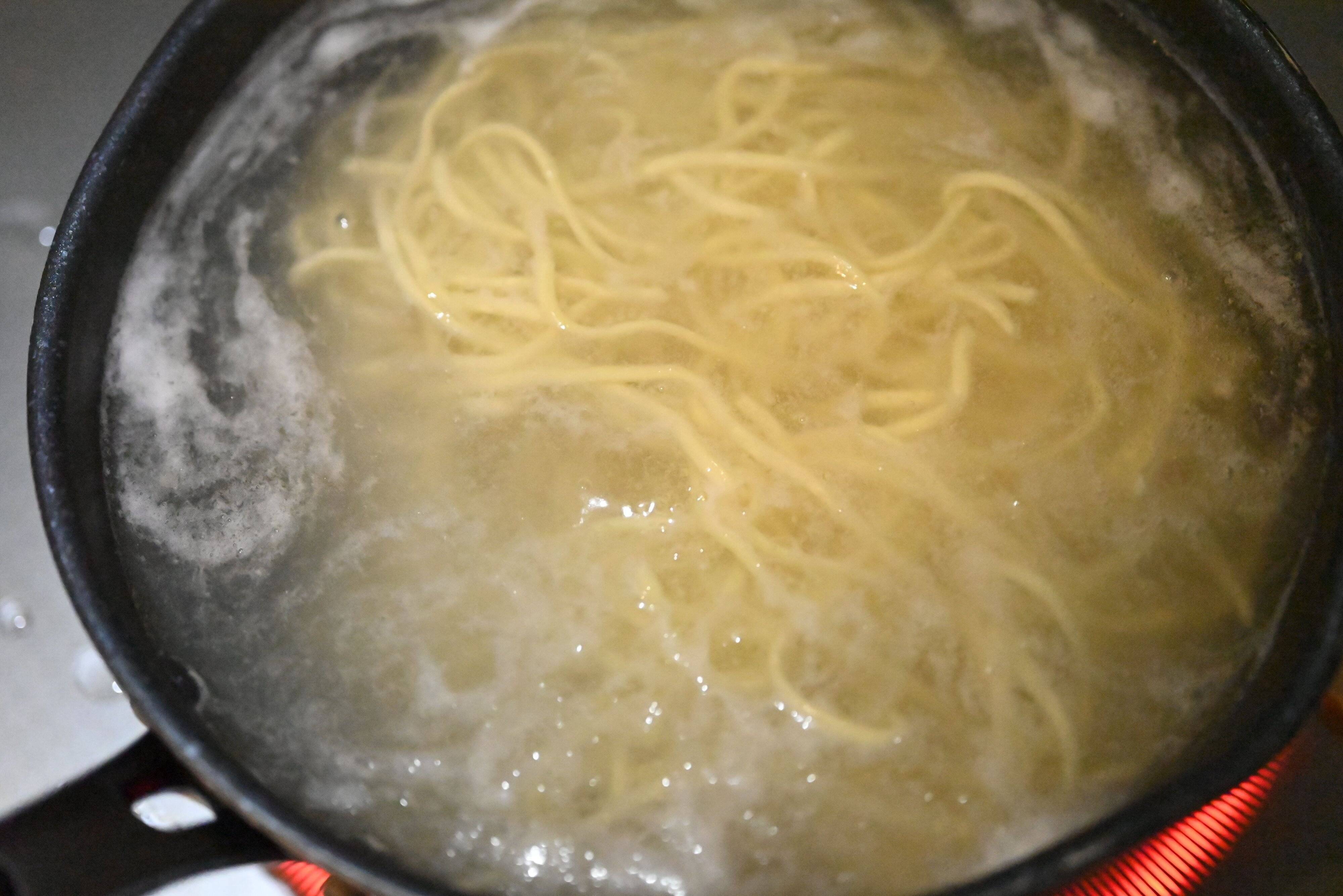 (1)大きめの鍋にたっぷり湯を沸かし、麺を3分ゆでる。