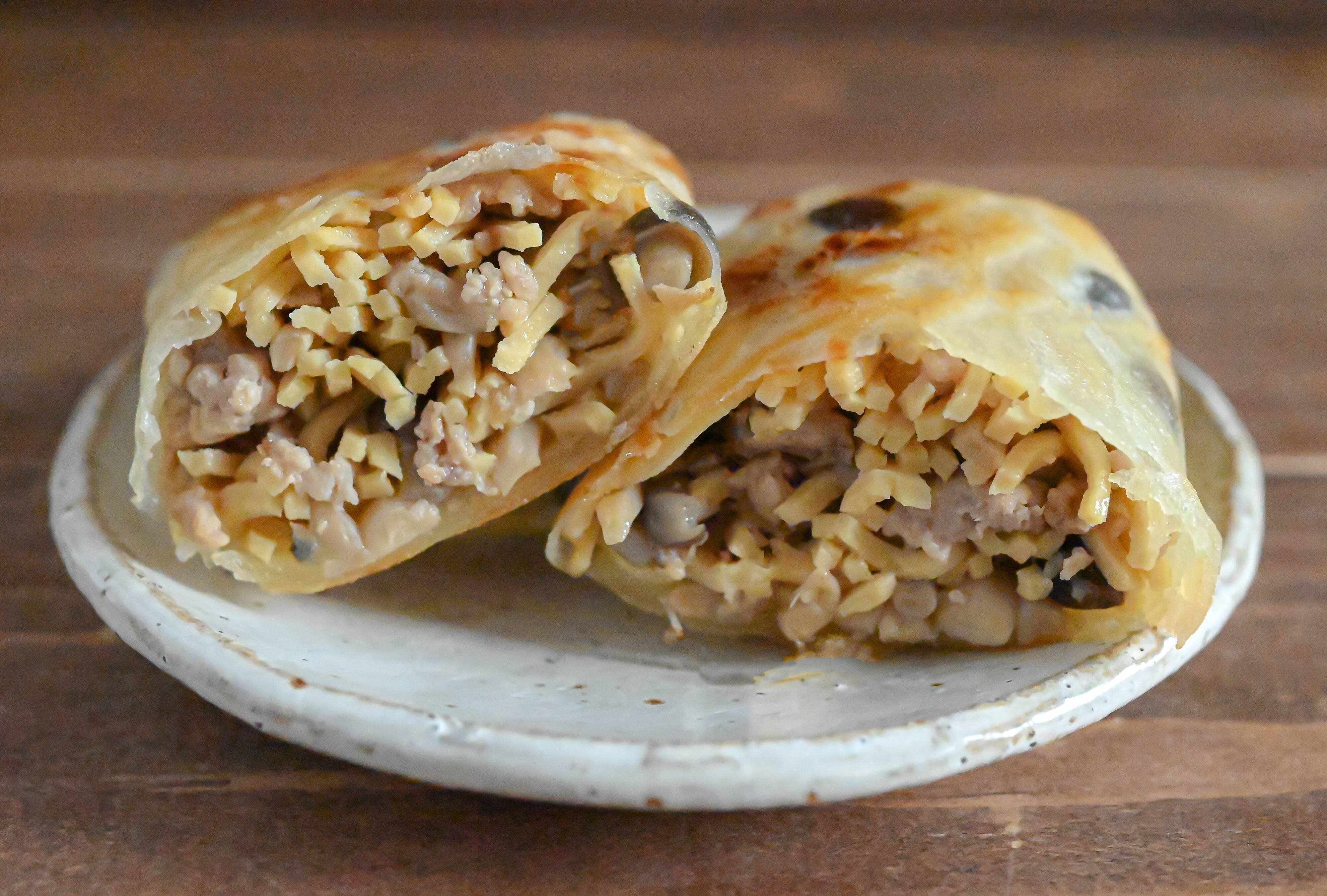 (4)春巻きの皮で(3)を包み、水溶き片栗粉で止める。