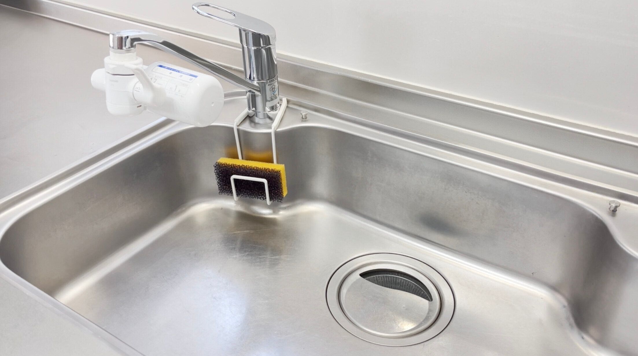スポンジ置き場には蛇口にかけるスポンジホルダーを設置。