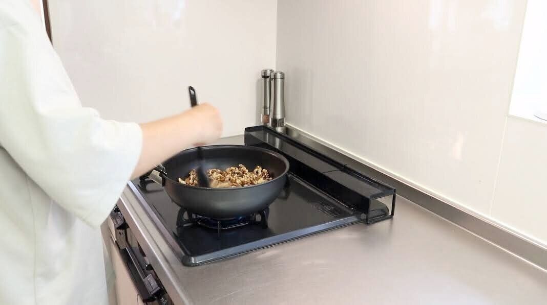 調理台やコンロ周りには物を極力出さないようにしています。油の飛び散りは広範囲に飛ぶもの。ホコリと合体し、しつこいベタつき汚れになると掃除が大変なことに…。最初から物を出さないでおくと、調理後はさっとクロスで拭くだけで掃除が完了します。
