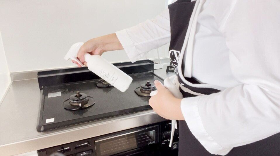 「セスキスプレー」は、セスキ炭酸ソーダ小さじ1を500mlの水に溶かして使います。重曹よりも洗浄力があり、手荒れもしにくくコスパが良い洗剤。油汚れの多いキッチンに置いておくと重宝しますよ。