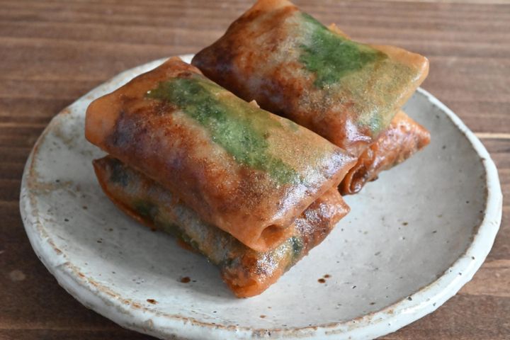 (3)春巻きの皮に納豆、大葉を4等分にしてのせて包み、水溶き片栗粉で止める。
