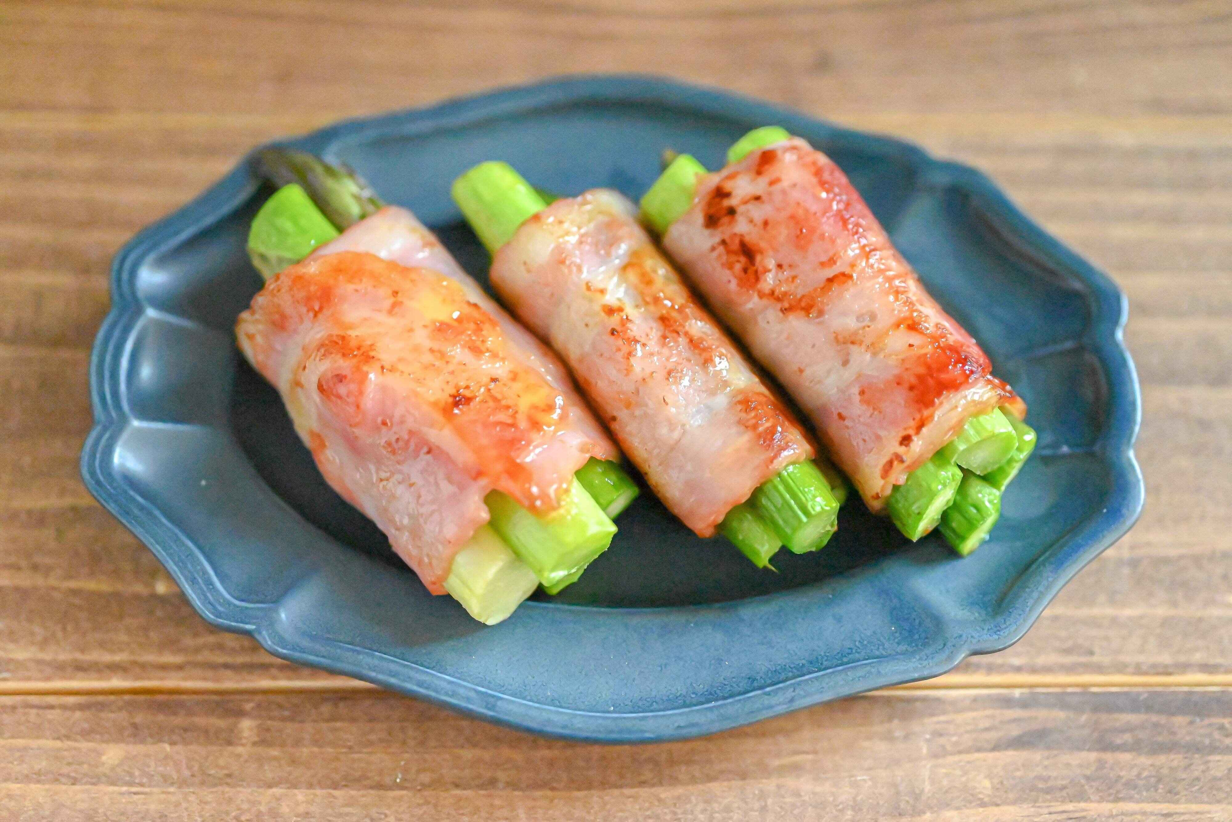 アスパラガスをベーコンで巻きましょう。