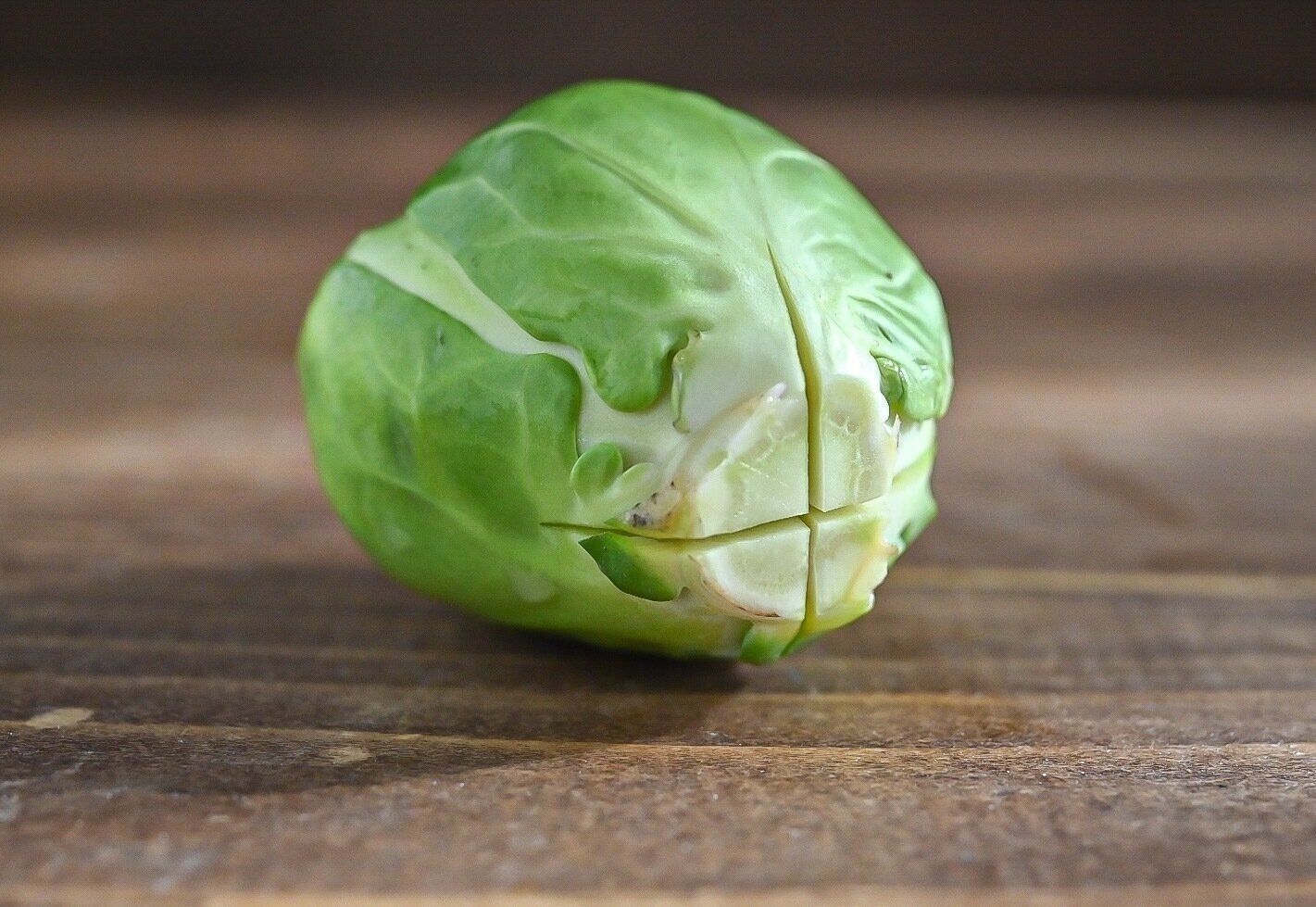 まず、芽キャベツの芯に十字の切り込みを入れます。