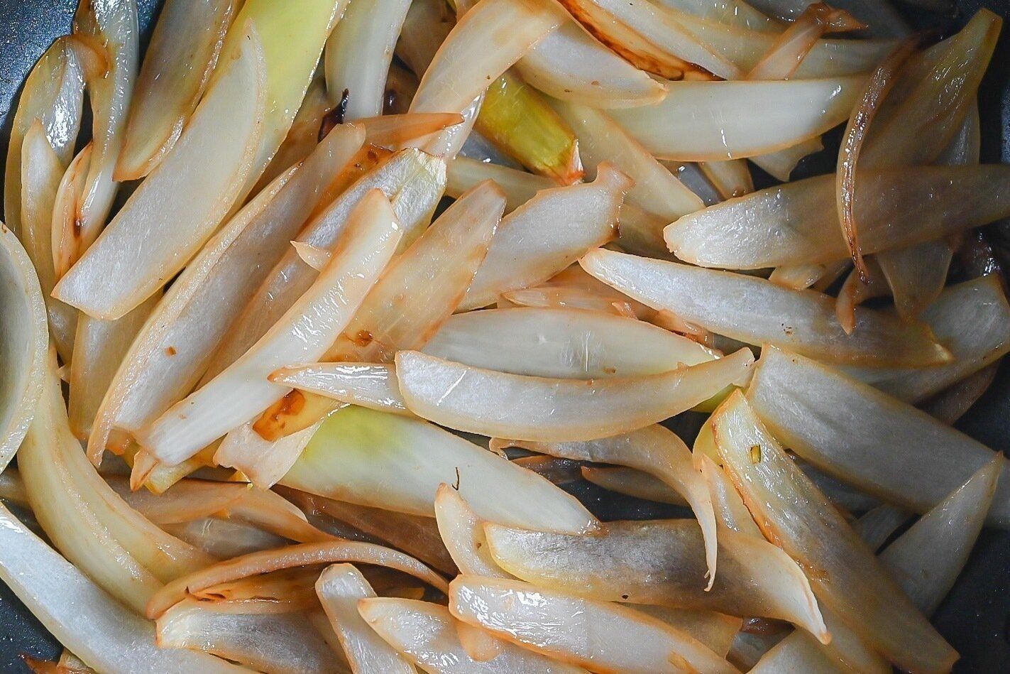 (2)玉ねぎはくし切りにし、中火にかけたフライパンで焼き色がつくまで炒めて取り出す。