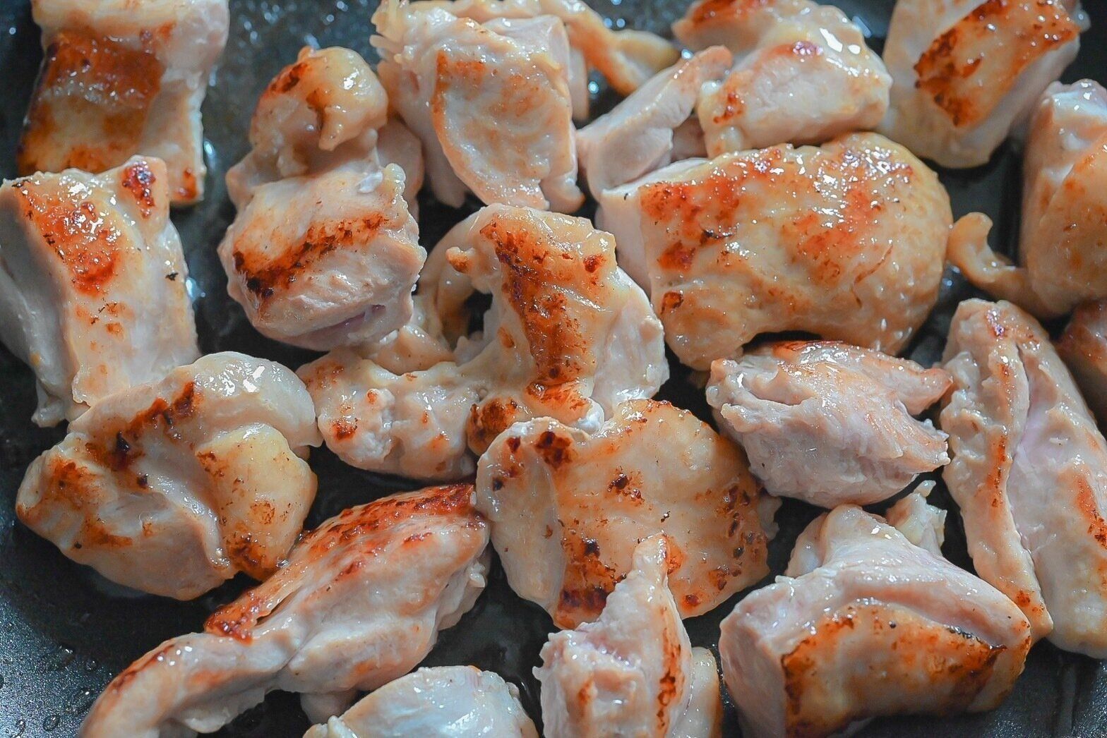 鶏もも肉の皮目を下にして焼き色がつくまで加熱する。