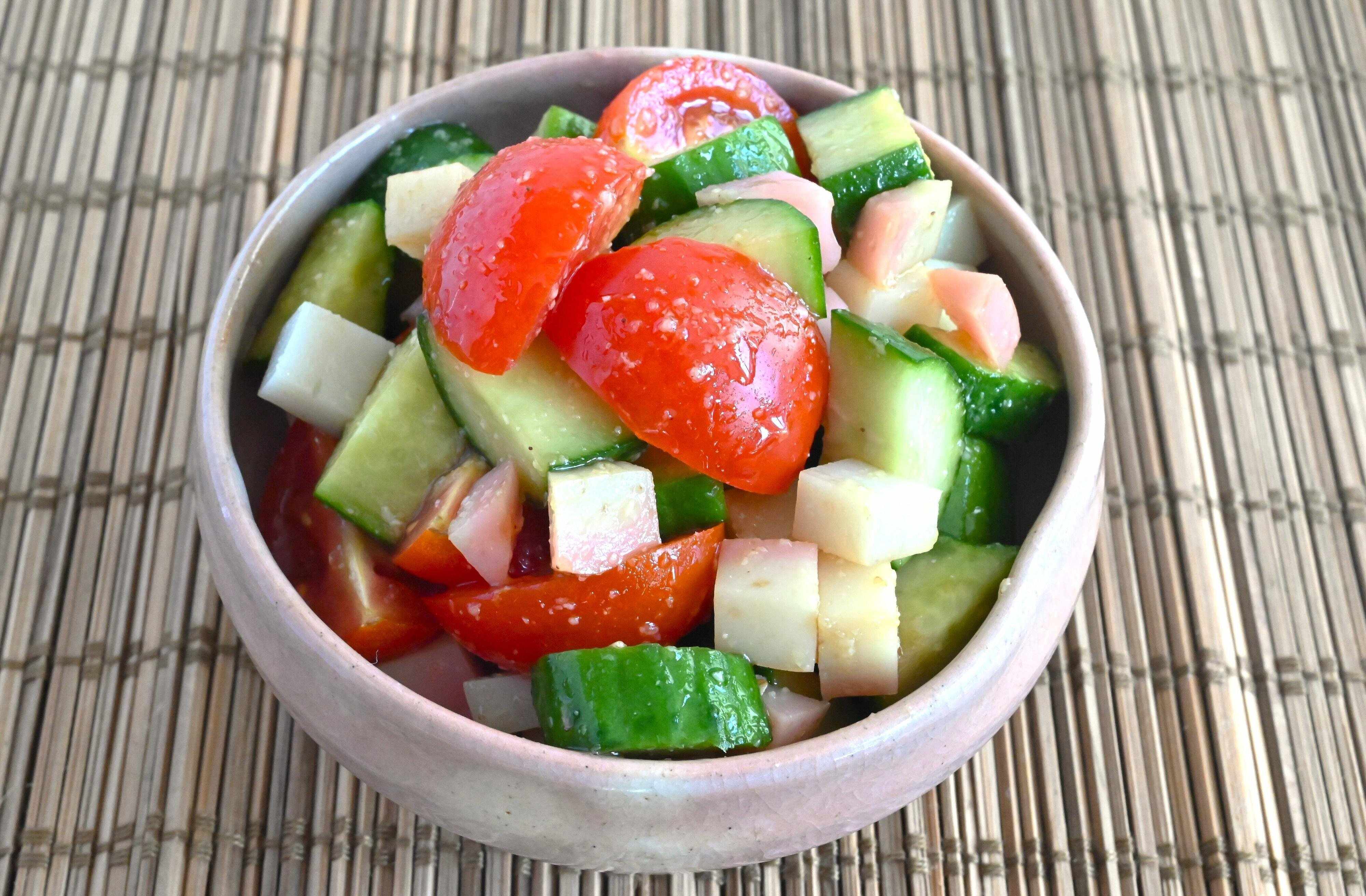 (1)きゅうりは1.5〜2cm角に切る。ミニトマトは1/4のくし切りに、かまぼこは5mm角に切る。