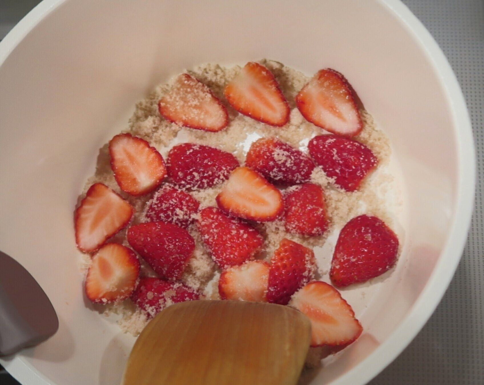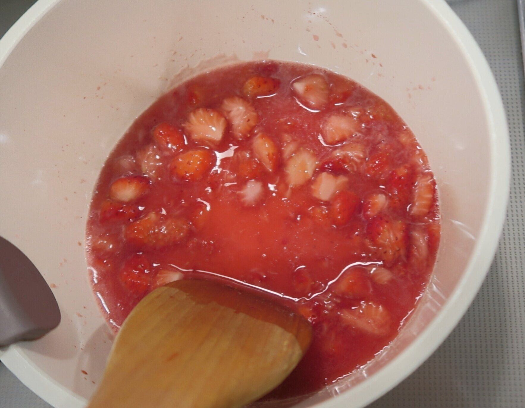 途中砂糖が溶けたら、ヘラでいちごの果肉をつぶします。