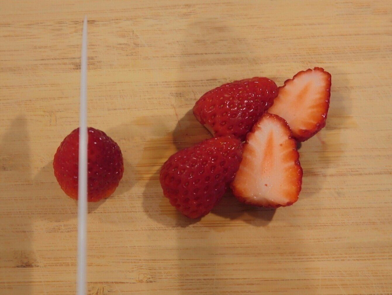 いちごは洗って、キッチンペーパーで水けをよくふき取ります。つづいてヘタをとり、たて半分にカットします。トッピング用のいちごもお好みの大きさにカットしておきます。