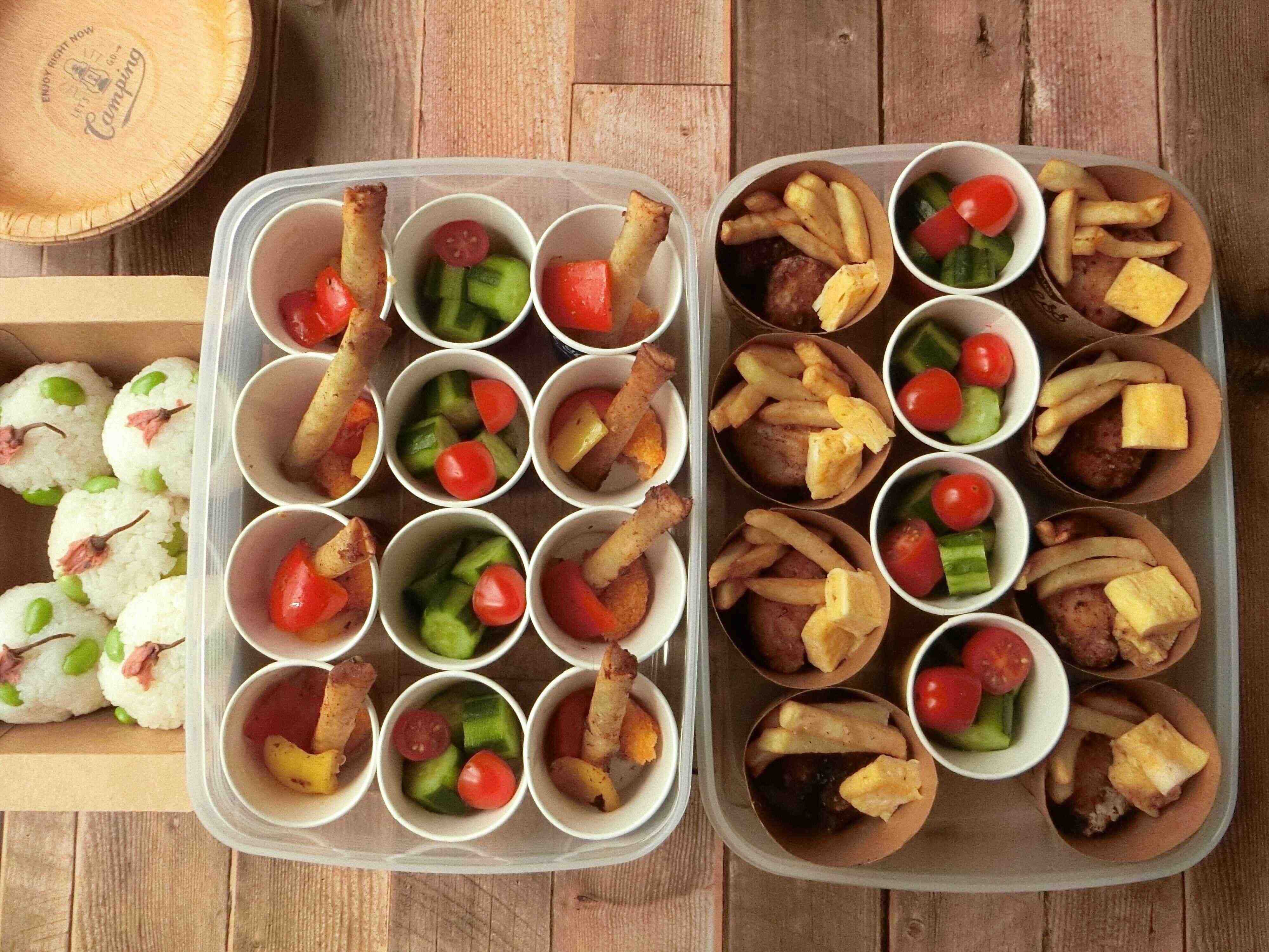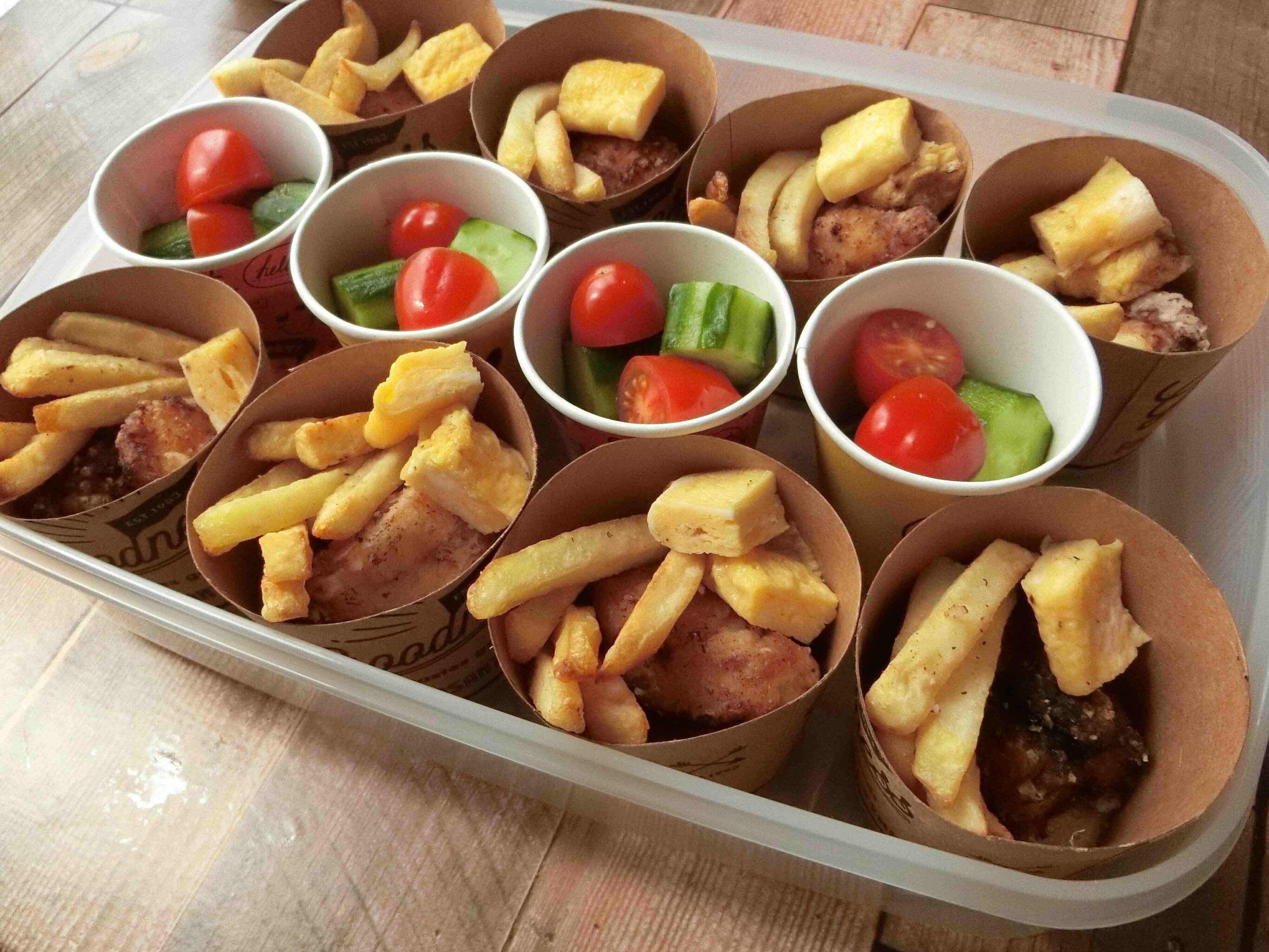 まずはおかずの準備。我が家のおかずはから揚げと卵焼き、フライドポテトとミニトマトが定番ですが、コロッケやミニ春巻き、枝豆やフルーツなどお好みのものを用意します。