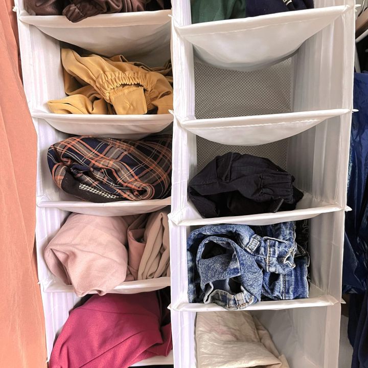 ボトムス専用のハンガーは使わずに、ふわっと丸めて吊り下げ収納の各小部屋に置いています。
