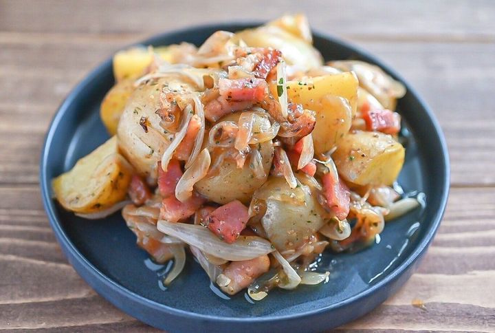 (1)ブロックベーコンは1cm幅に切り、新じゃがいもはよく洗って4等分に切る。