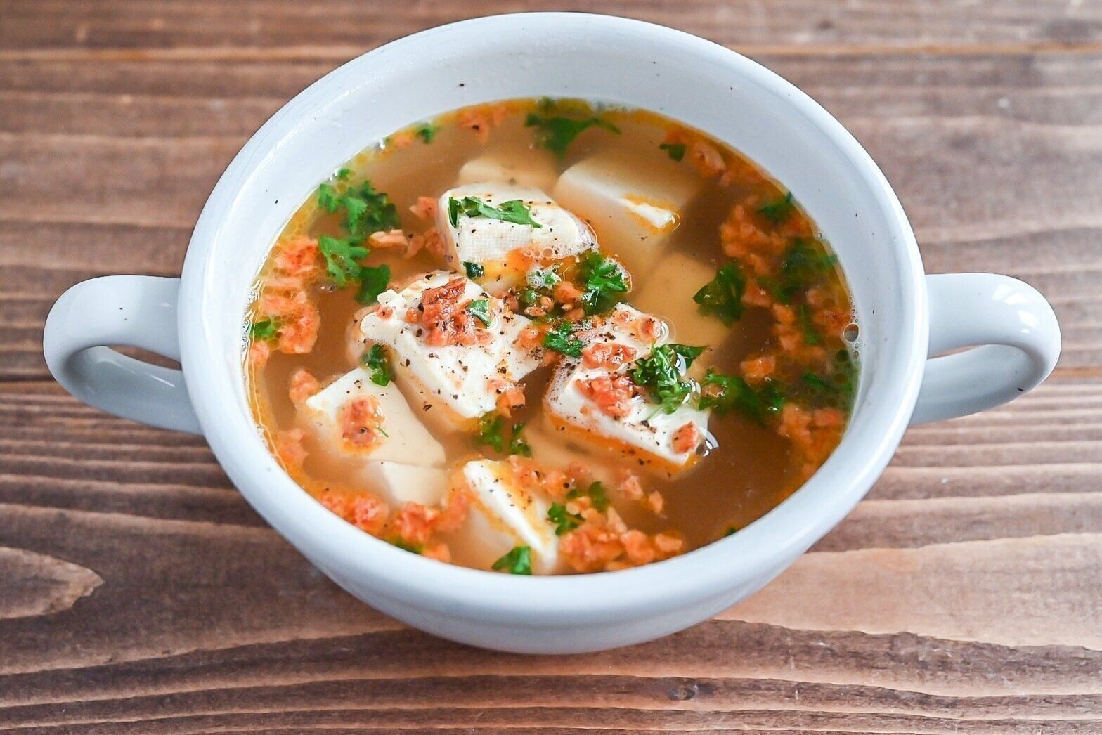 (2)鍋に木綿豆腐、顆粒コンソメ、水800mlを入れてひと煮たちさせる。