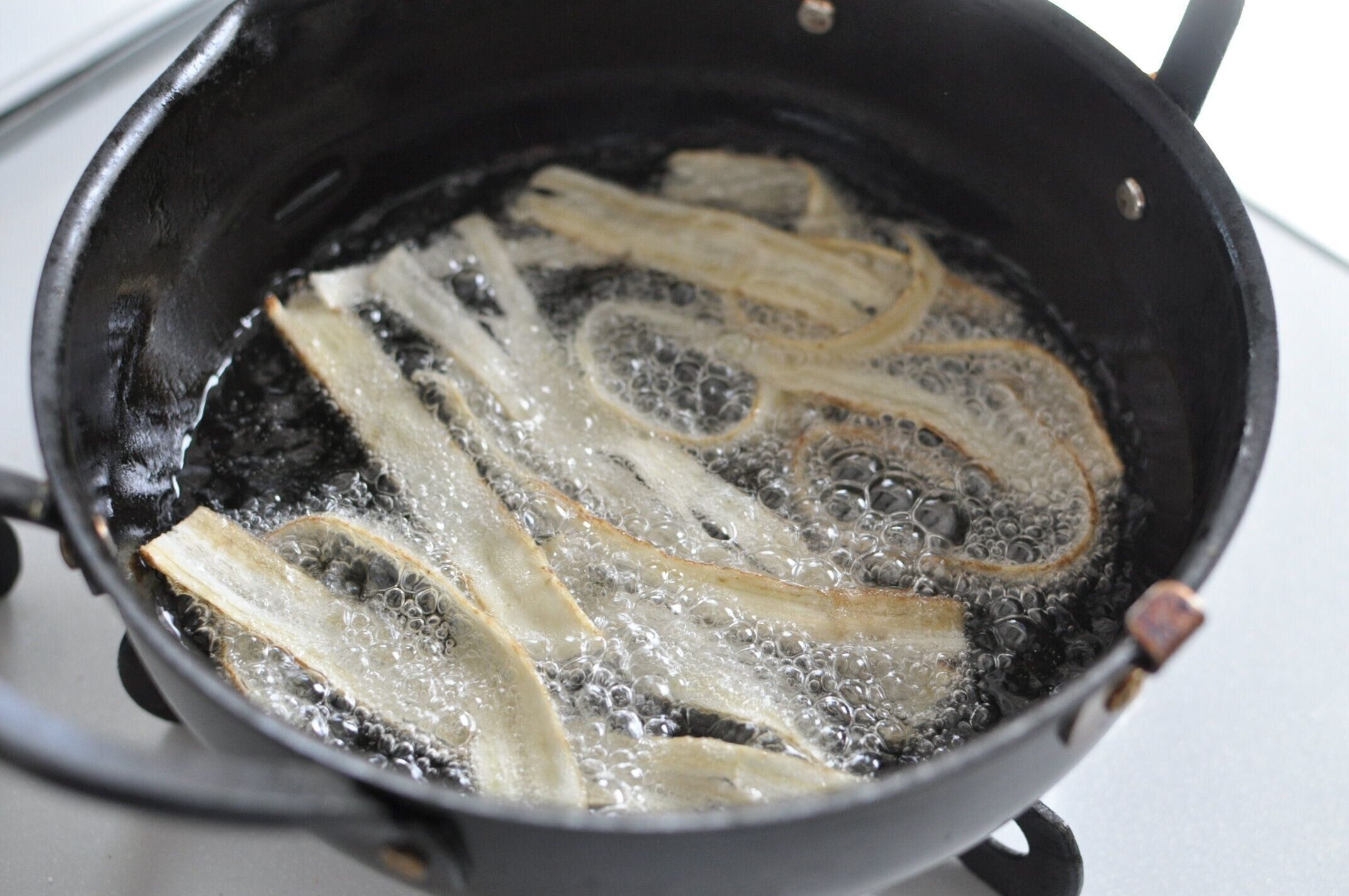 ごぼうはピーラーで薄くスライスすると、軽く揚げるだけでパリパリのチップスができます。ぜひ作ってみてくださいね。