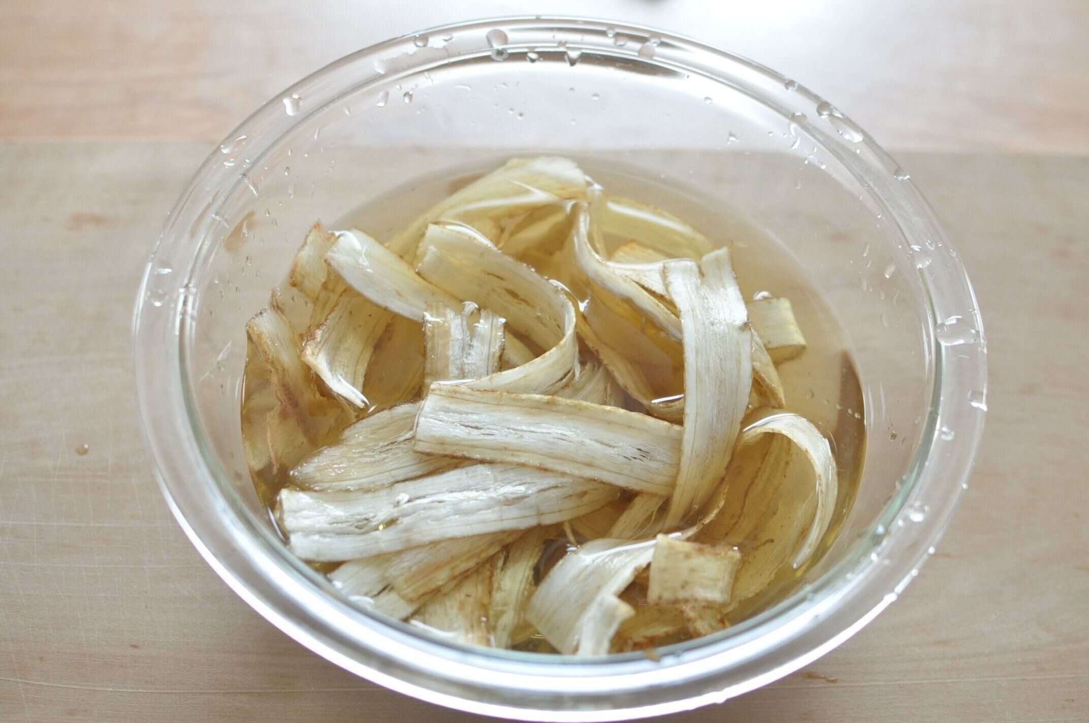 ごぼうは、1/2本をさらに半分に切り、ピーラーで薄くスライスして水にさらします。