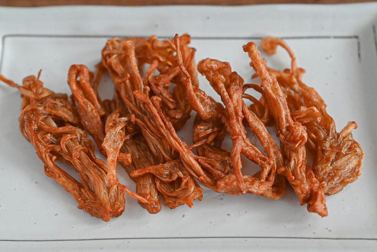 (4)フライパンの底から1cmの高さまで揚げ油を入れて中火にかけ、えのきがカラっとするまで揚げて完成。