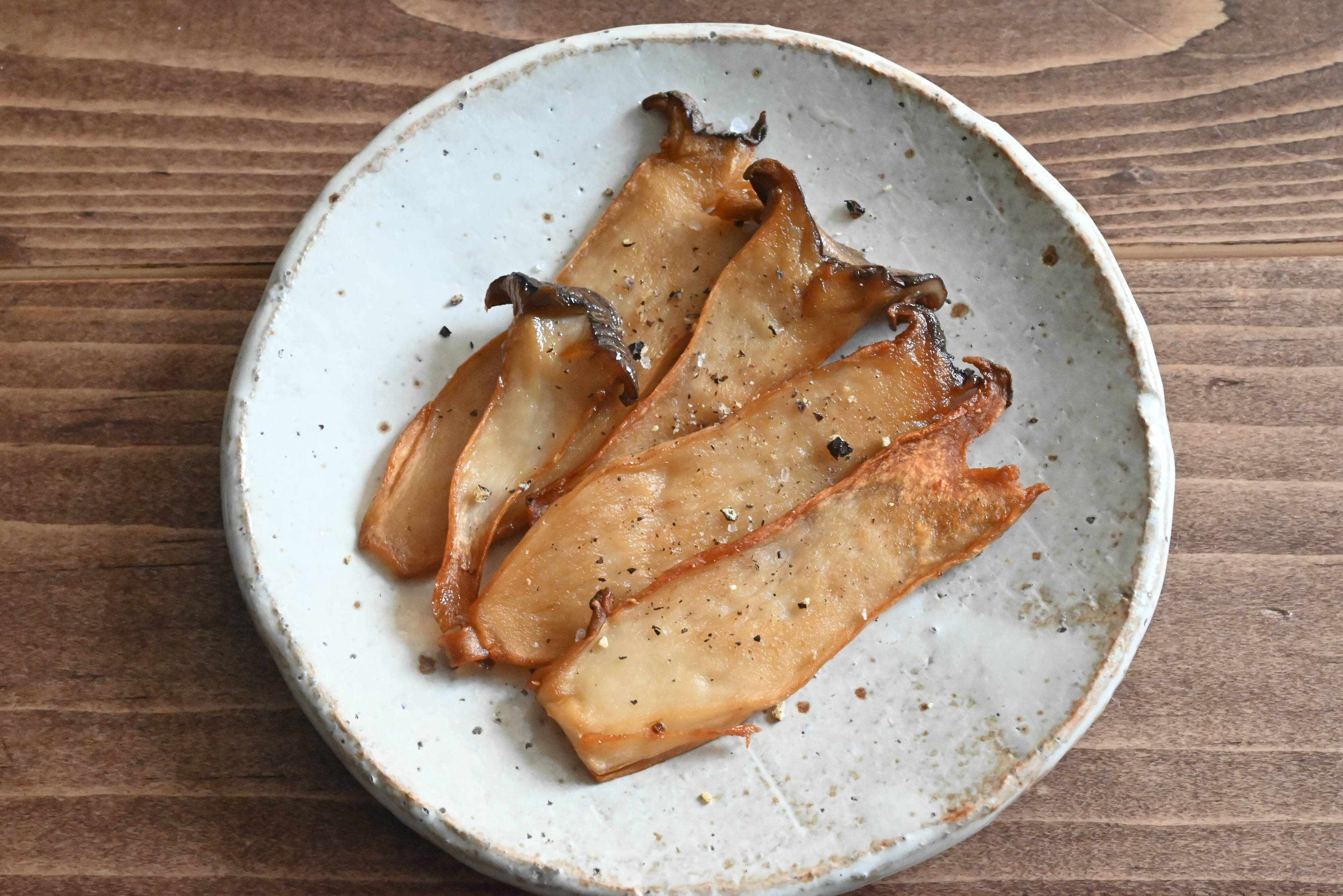 (3)エリンギがカリッとするまで両面しっかり焼いて皿に盛り、塩をかけて完成。