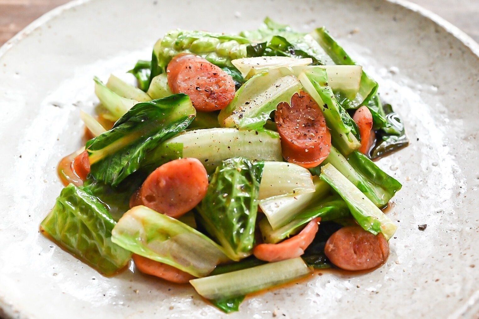 炒めて!ソーセージとロメインレタスのしょうゆ炒め