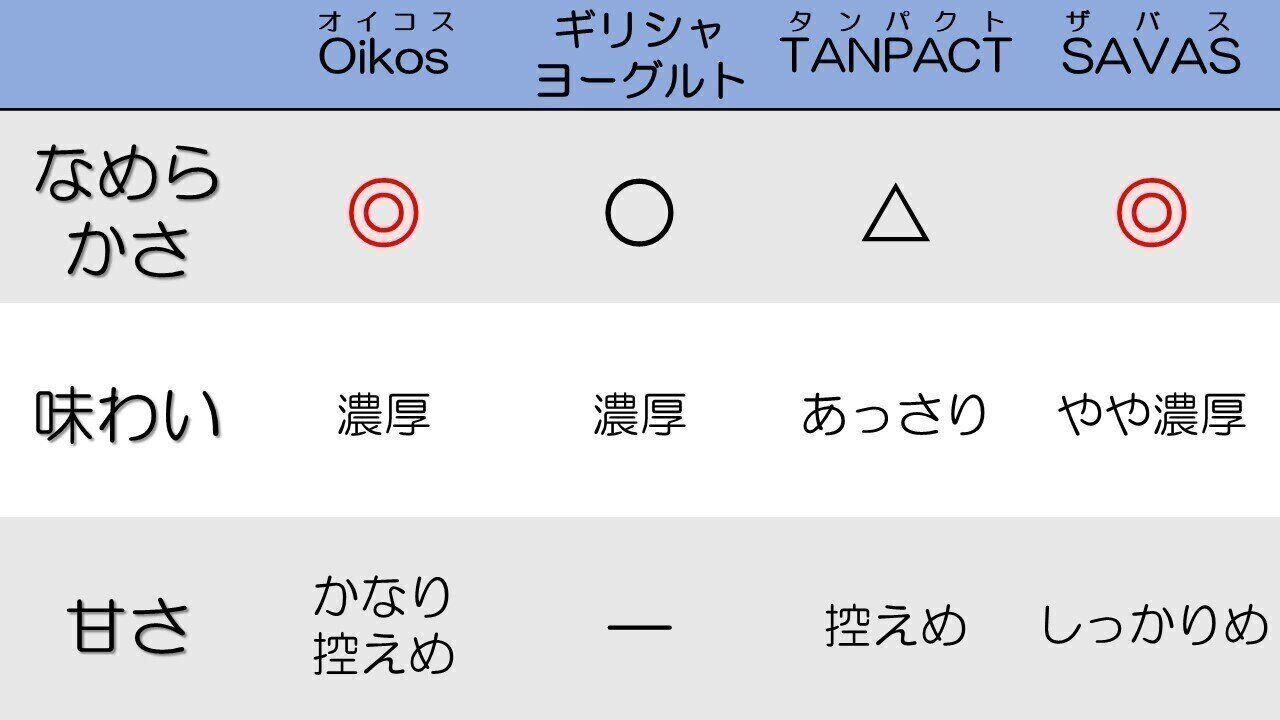 味わいについては、「Oikos」「ギリシャヨーグルト」「SAVAS」「TANPCT」の順で濃厚さが感じられました。