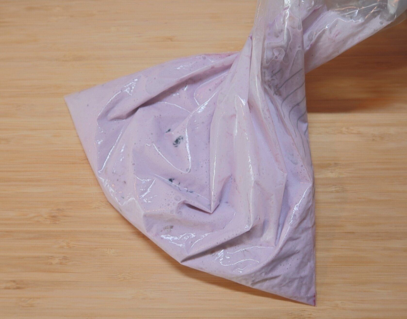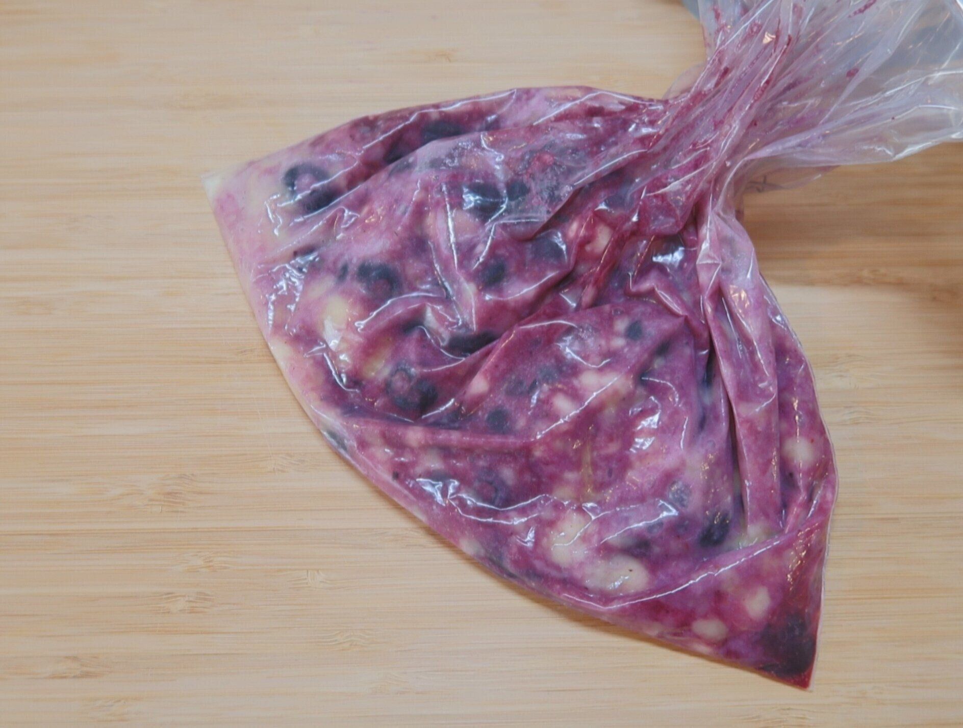 ジッパー付きポリ袋に、皮をむいたバナナと、(1)のブルーベリーを入れ、なめらかになるまで手でよくもみます。