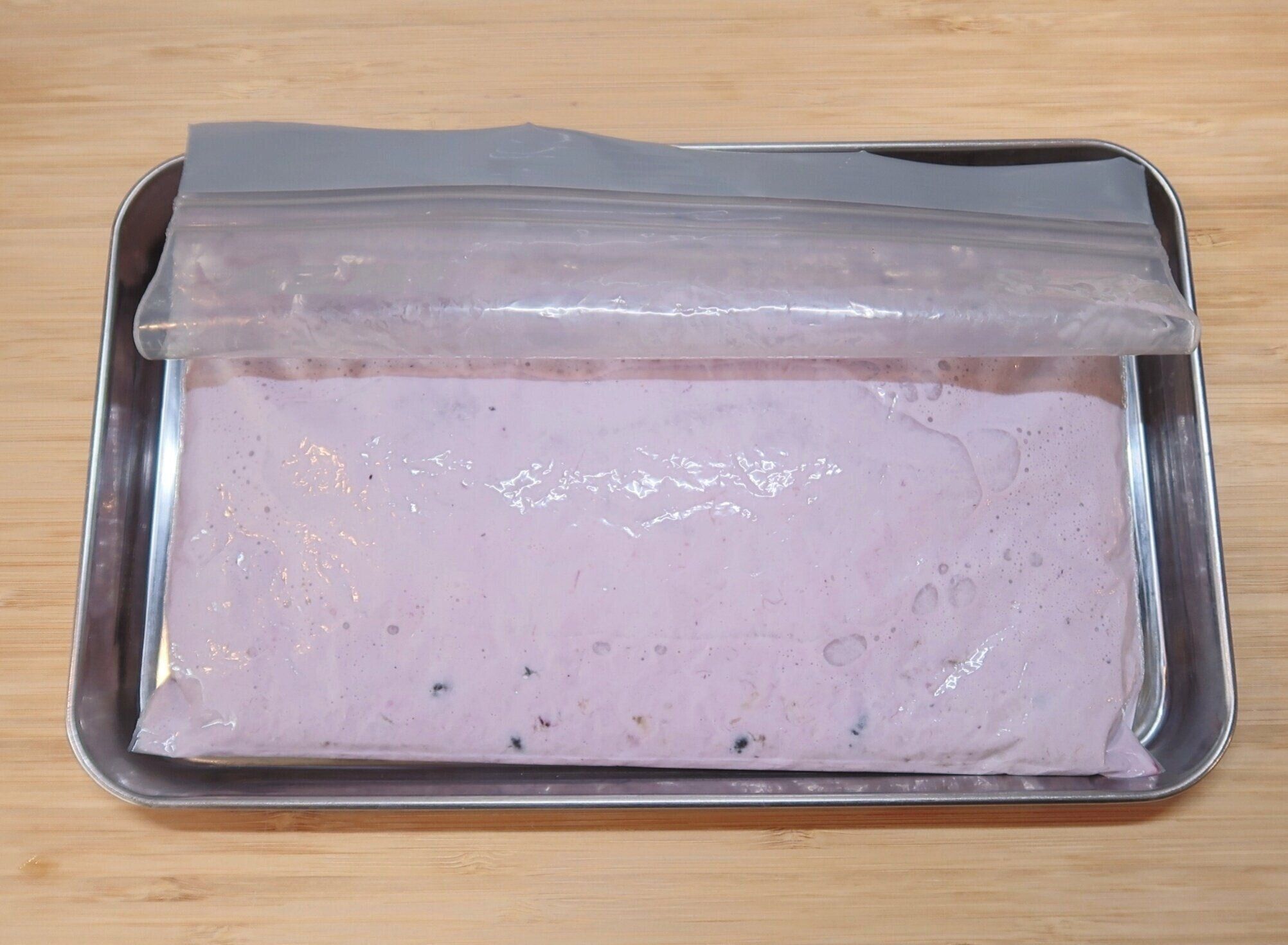 空気を抜いてジッパーを閉じ、バット(またはお皿)にのせます。うすく平らにならし、冷凍庫で約1時間半冷やします。