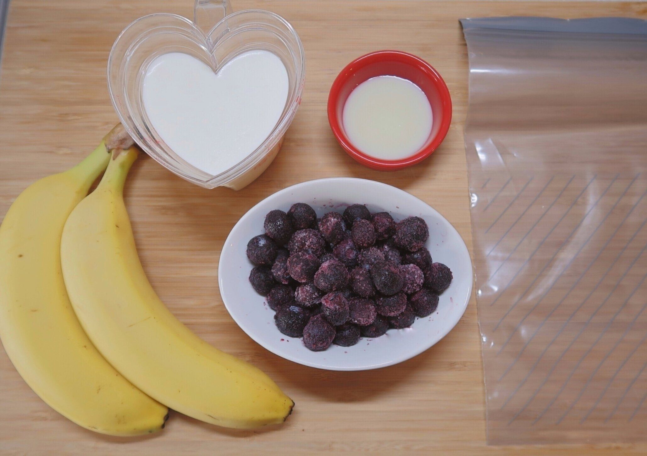 材料を混ぜて冷やすだけの「ブルーベリーとバナナの濃厚アイス」。