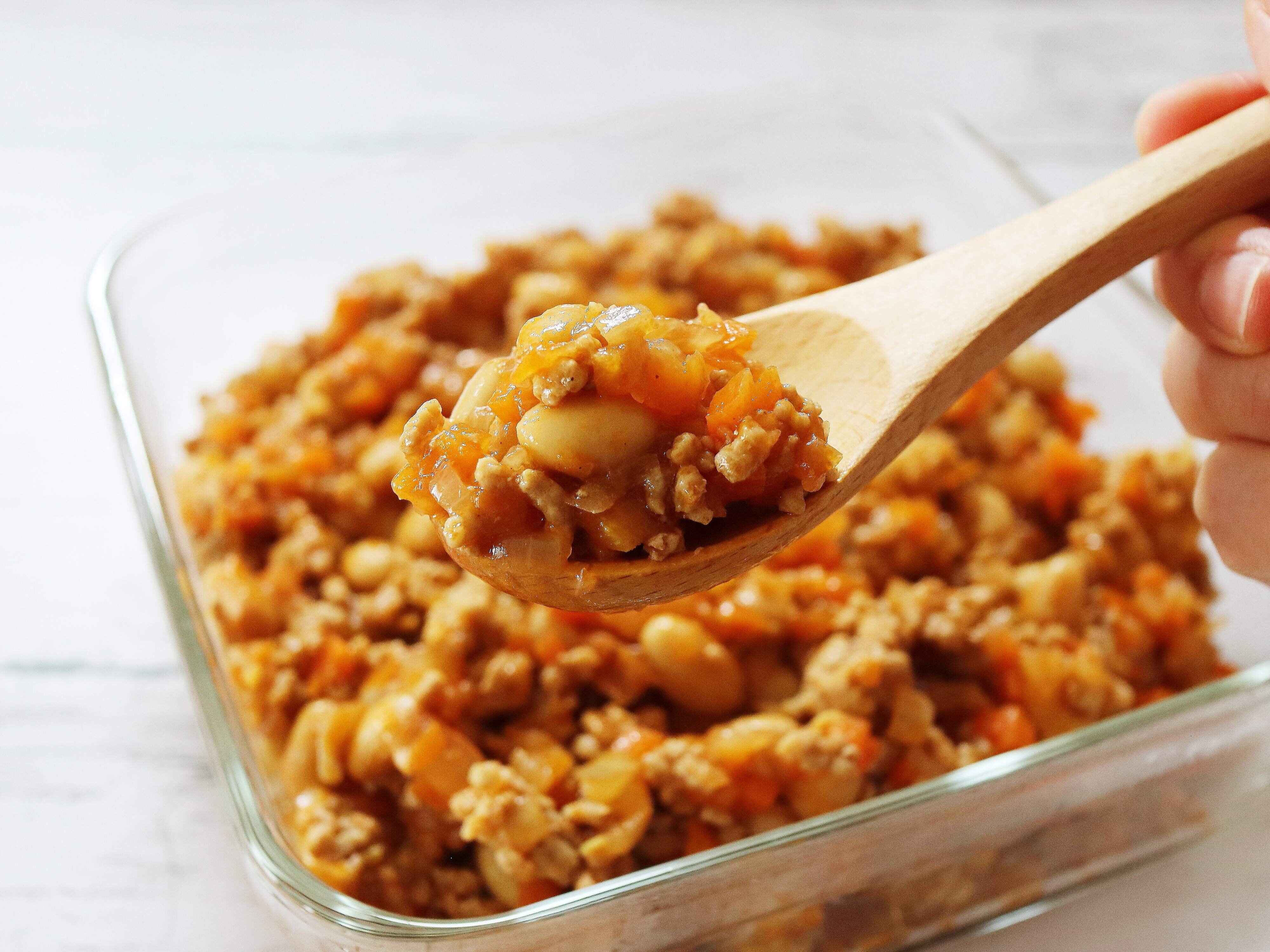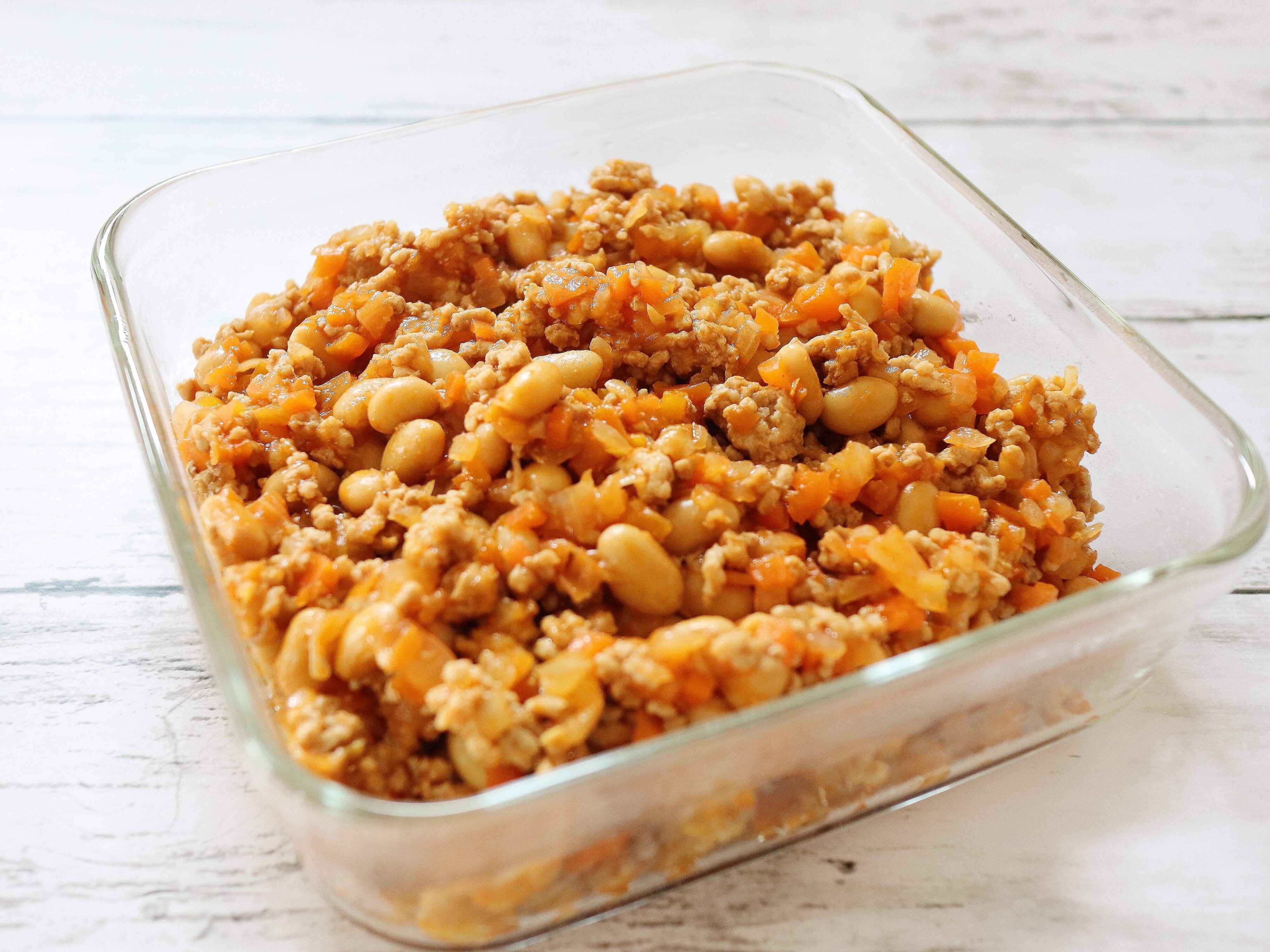 肉・野菜・豆をまとめて摂れる「ポークビーンズ」を作り置きしておくと、色々な料理への使いまわしができてとても便利。