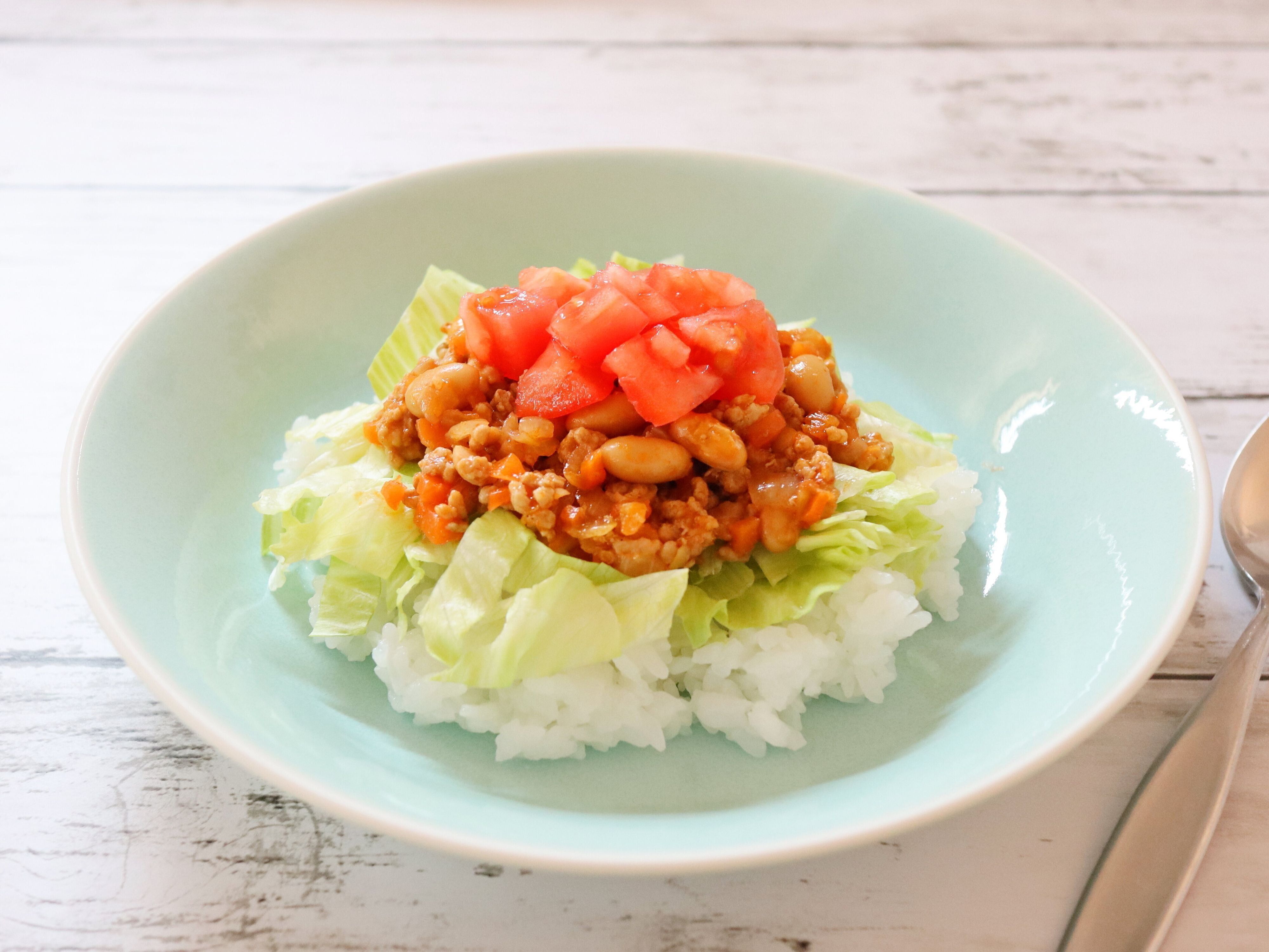 ごはんの上に、ちぎったレタスとポークビーンズ、カットトマトをのせるタコライス。